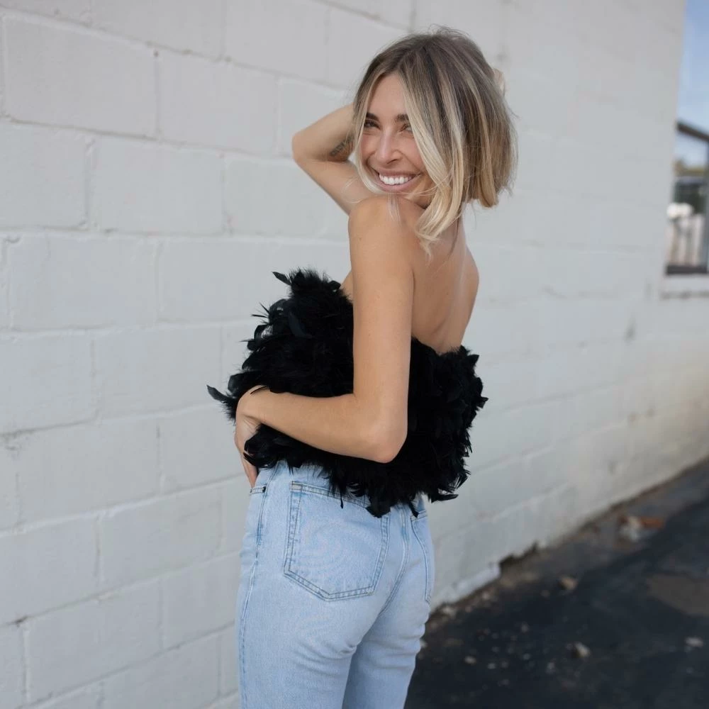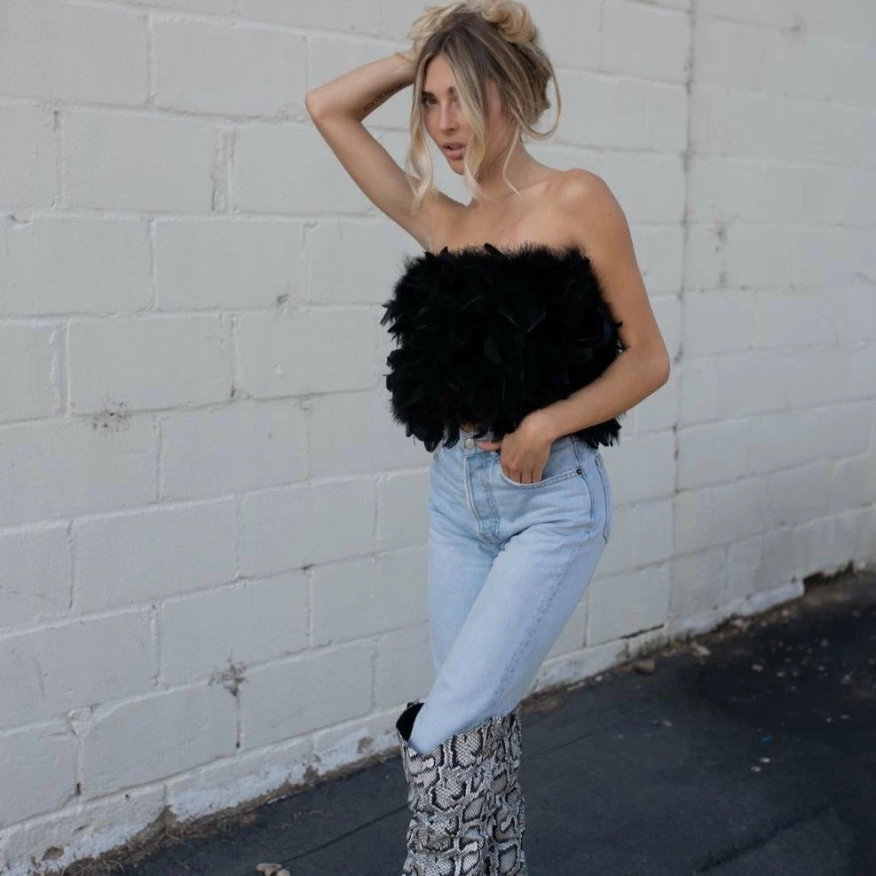 Nope, you’re not seeing things. Meet the Bea Feather Top, which can also be worn on the bottom as a skirt. An elegant poppy feather-embellished bandeau top for those nights out on the town. Slide it on top and pair with high-rise denim, or slide it on the bottom with a bodysuit. Add a cloud bag and a pair of your favorite heels or cowboy boots and you’ve got a showstopper. Runs a little loose.