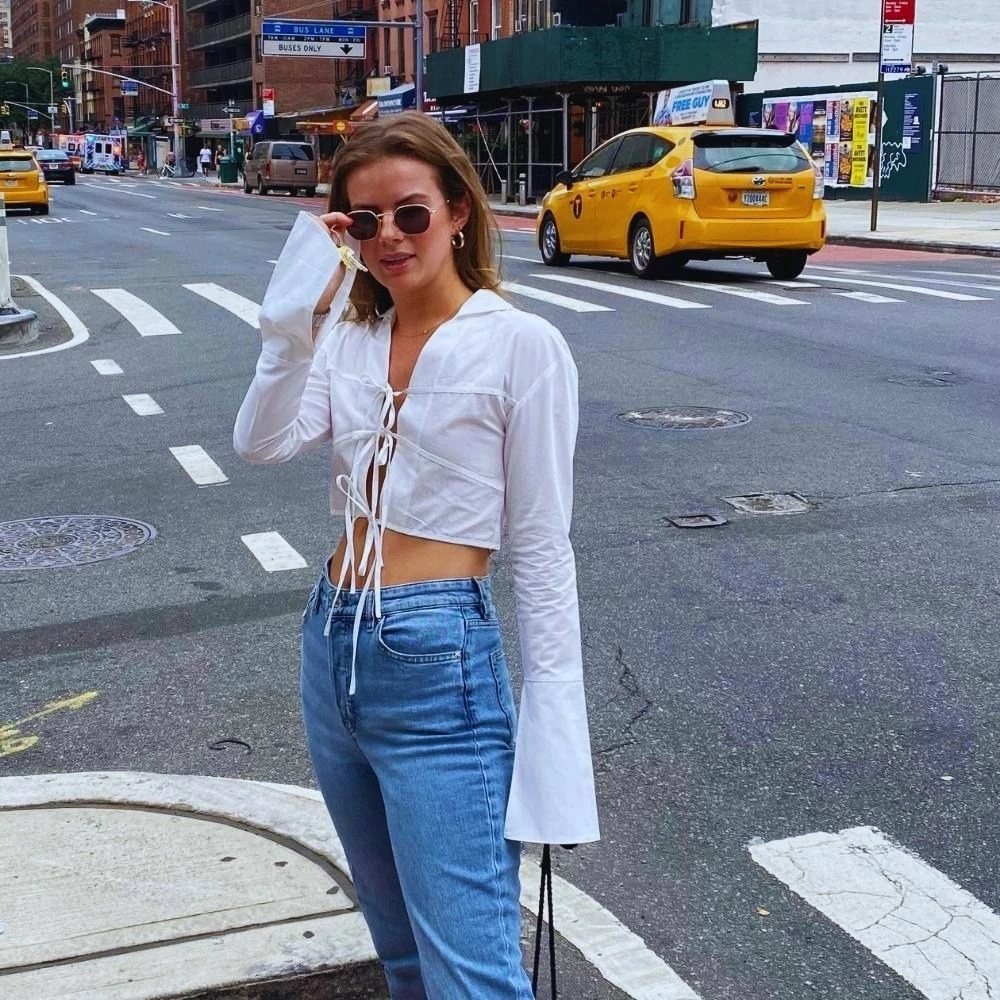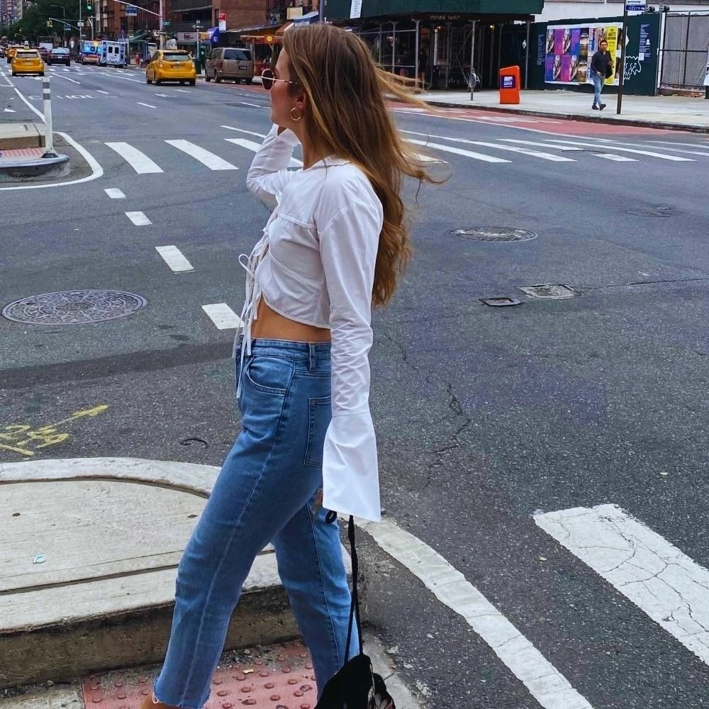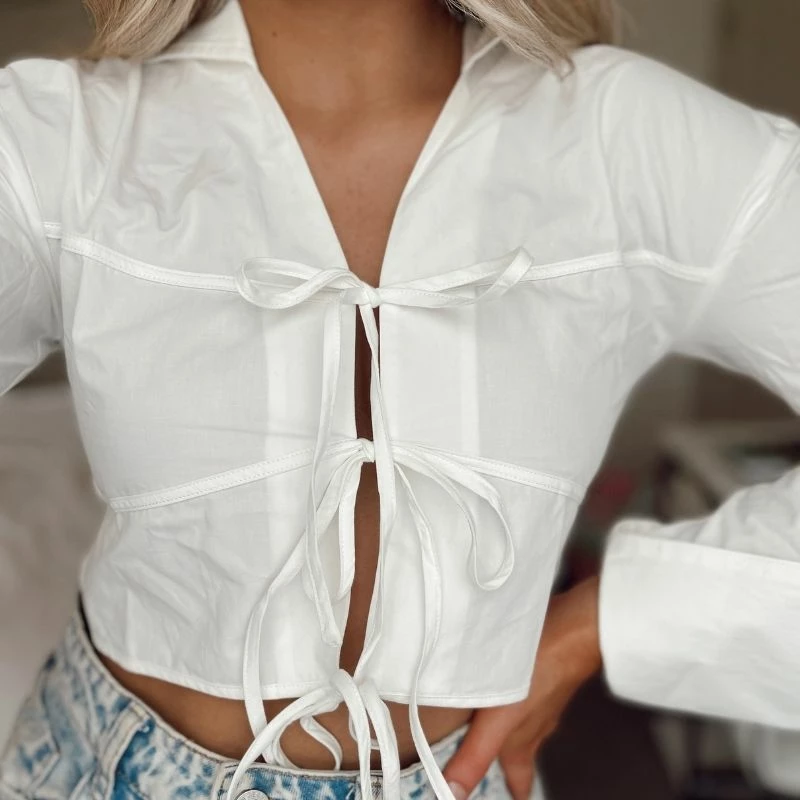Your new favorite white long sleeve crop top for the daytime, and the evening. The Blair Long Sleeve Crop Top is a 100% Cotton Poplin cropped long sleeve blouse featuring extended flared sleeves, split cuffs, front ties, and a spread collar. We love the semi-structured fit of the top and the party business vibe. Pair yours with denim or your favorite trousers.