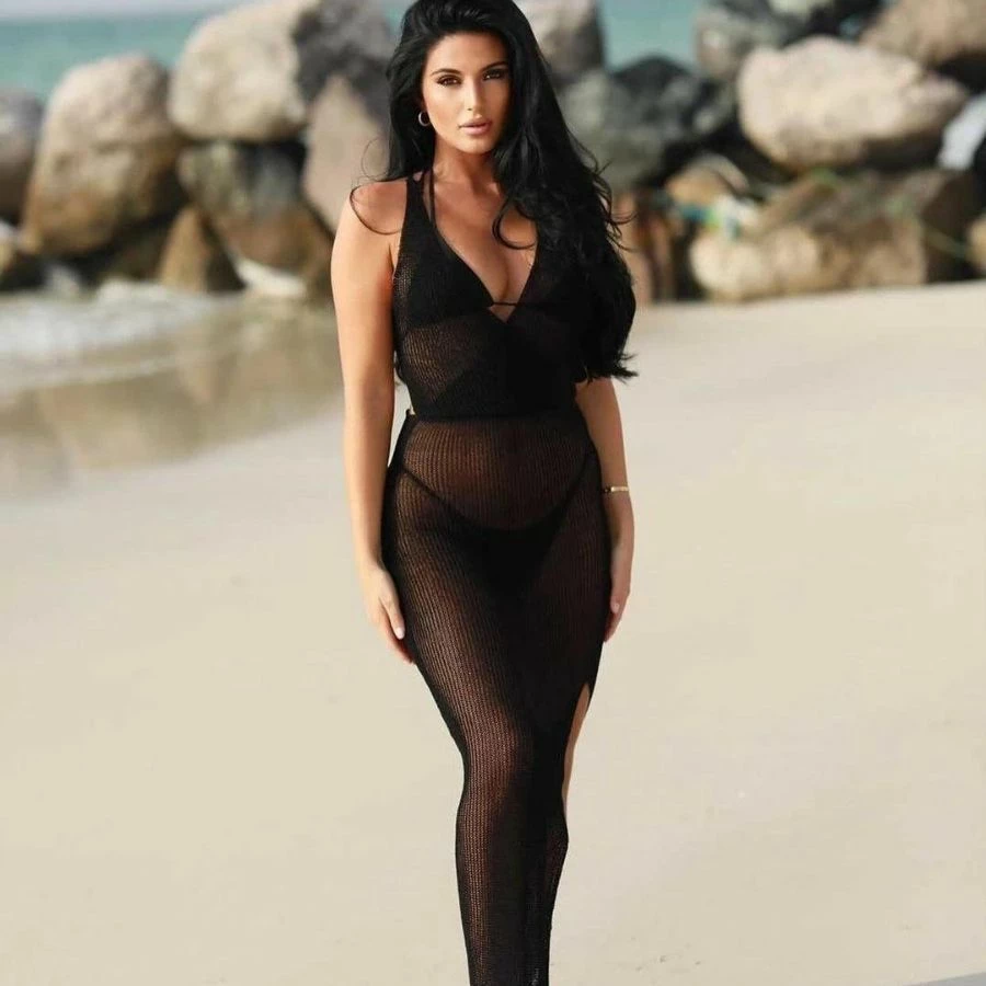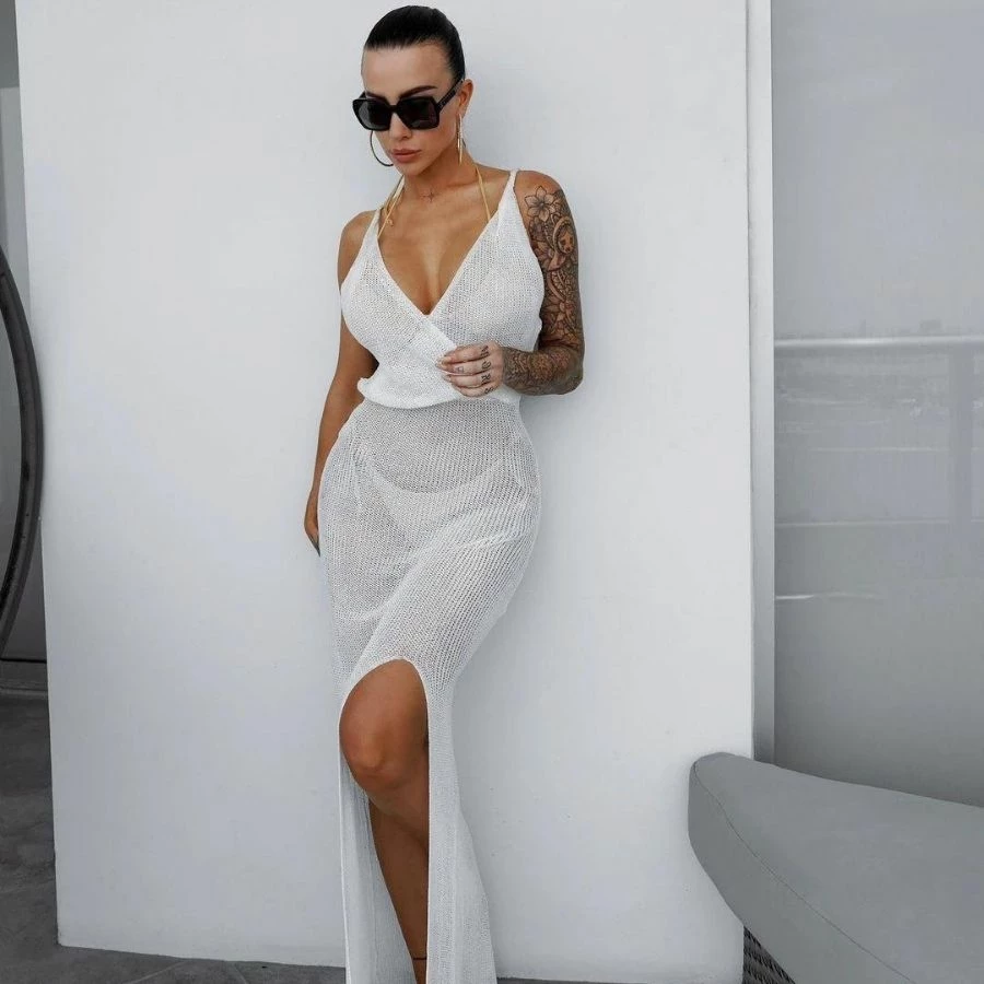 Our Crochet Cover Up went viral last summer and is the perfect maxi dress beach cover up to kick your outfit up a notch. Features pullover spaghetti straps that seamlessly create a criss-cross back, a deep v-neckline, and a semi-translucent crochet fabric. Essential for a vacation getaway or pool party. Style over your favorite swimsuit, or wear as a dress with pasties and strappy sandals. Hits at mid-calf.