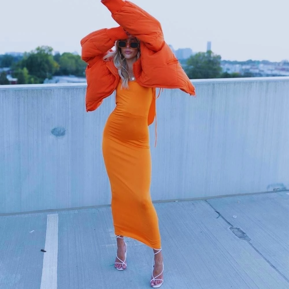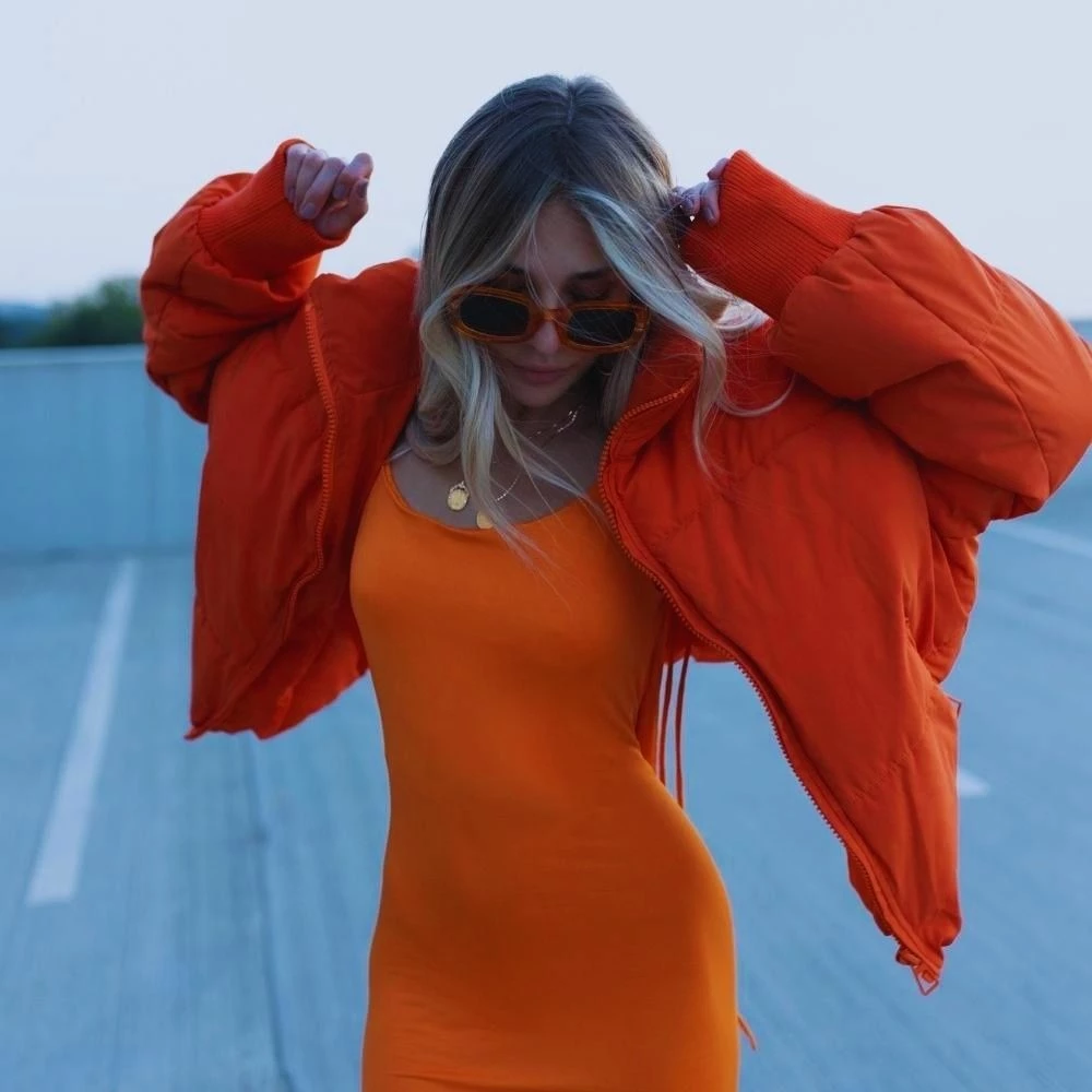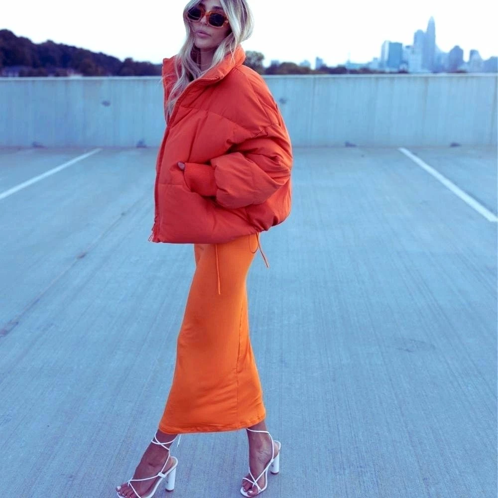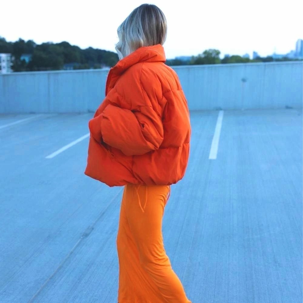 Need! And going fast. The Erin Oversized Puffer Jacket features an oversized fit, front zip-up pockets, a front zipper closure, cuffed sleeves, and a stand-up collar. Filled with sustainable down feathers. Style this orange monochrome puffer with your favorite matching dress, denim, or everyday fit. The ultimate puffer jacket in comfort and style for timeless seasonal wear. Unisex.