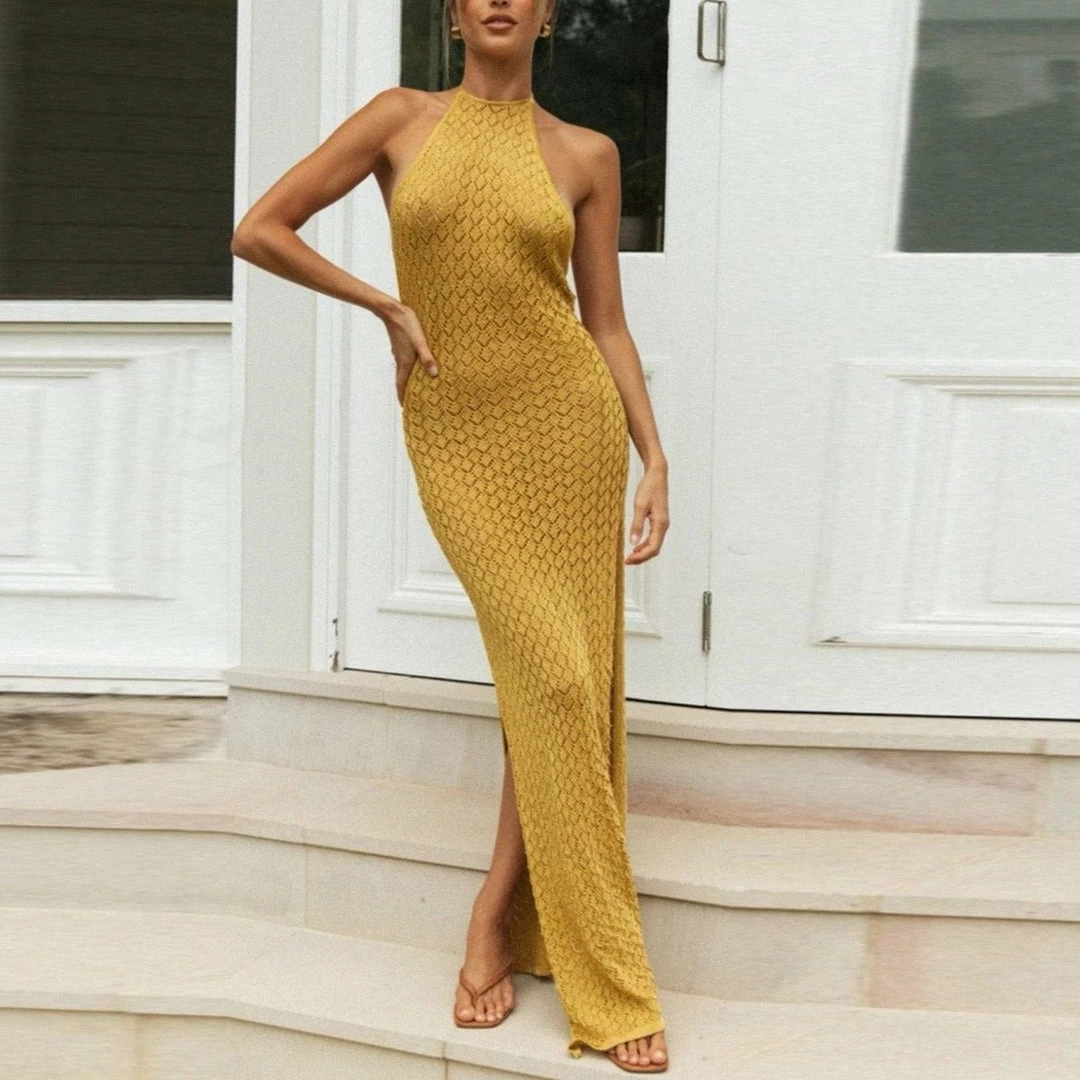 The Iris Halter Knitted Maxi Dress is that long split dress you stun with on vacation or in the evening with friends paired with a denim jacket or blazer. This slide-on and ready to go straight cut dress features an open low back cut, a halter tie-around neck, and slits down both sides. Style as a beach cover up, or as a long maxi dress. Style with strappy sandals, with a swimsuit under, or without. Semi-transparent. Hits above the ankle.