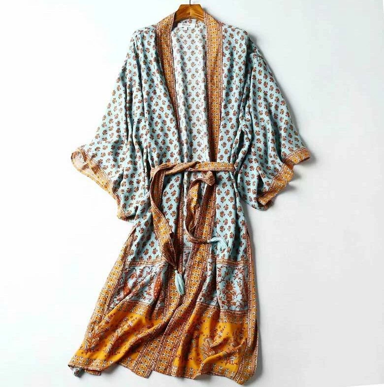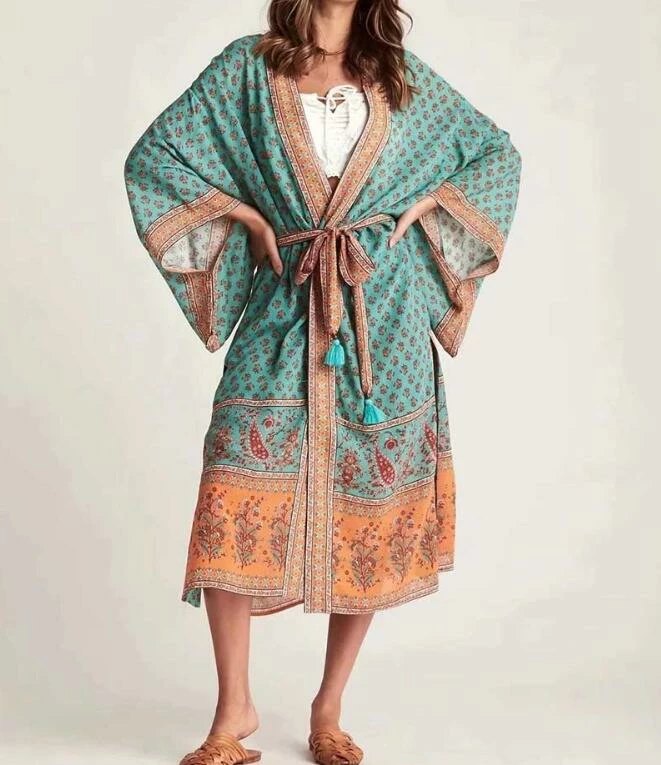 Our Lailee Kimono Robe radiates major vacation vibes even if you’re on Zoom calls for the time being. Features an oversized fit, a bohemian floral print, v-neckline collar, batwing sleeves, a maxi length, and a tasseled waist belt. Let this breathable caftan robe drape over your swimsuit, or pair with denim and a white t-shirt like we do. We love styling it as a cardigan, an at home robe, or a swim cover up with a bit of extra character.