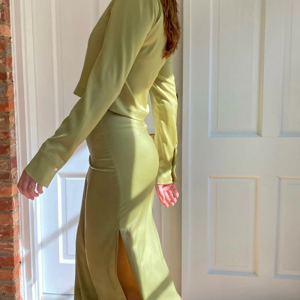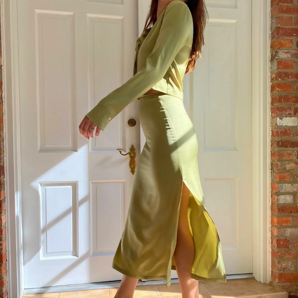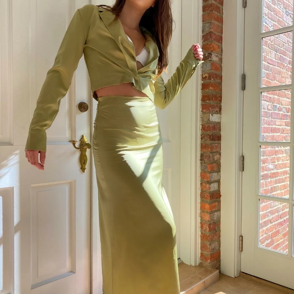 The Light Green Midi Maxi Skirt Set is a great midi-maxi skirt set. The satin midi skirt features a high rise, side slit, and hidden side zip, and is sold with the matching quarter sleeve crop top. The top features a turndown collar, loose fit, and semi-cropped length. We love the cut of the skirt and placement of the slit which crafts a beautiful silhouette. Pair together, or style the top with your favorite denim, or the skirt with your favorite white tank top. Perfect either way.