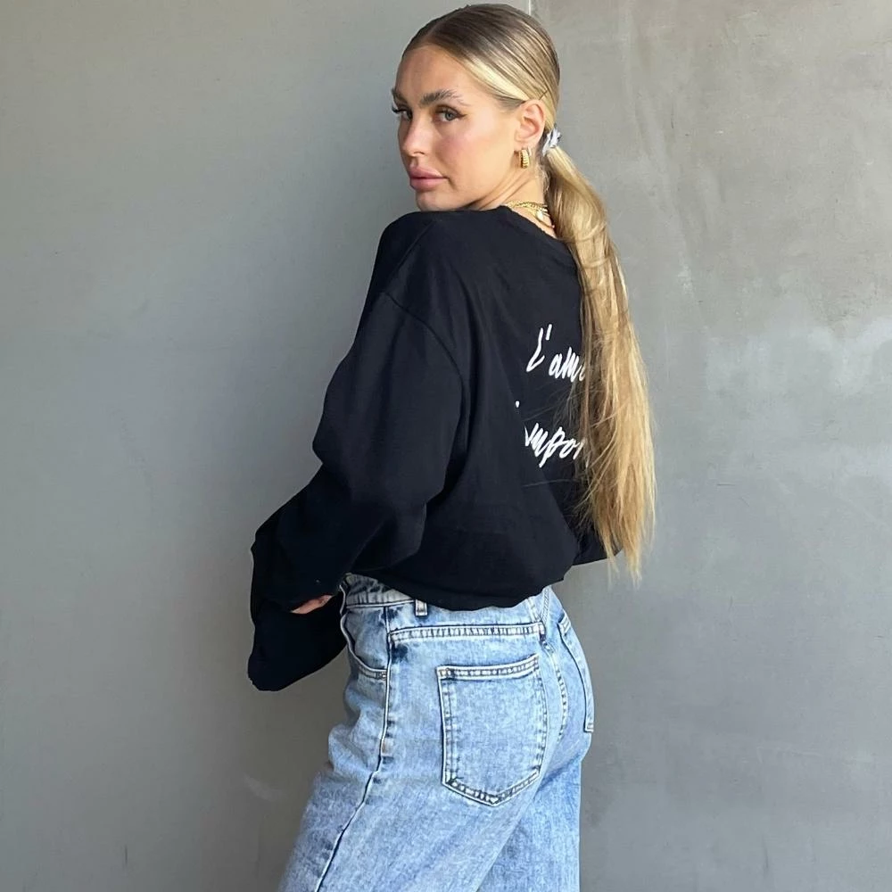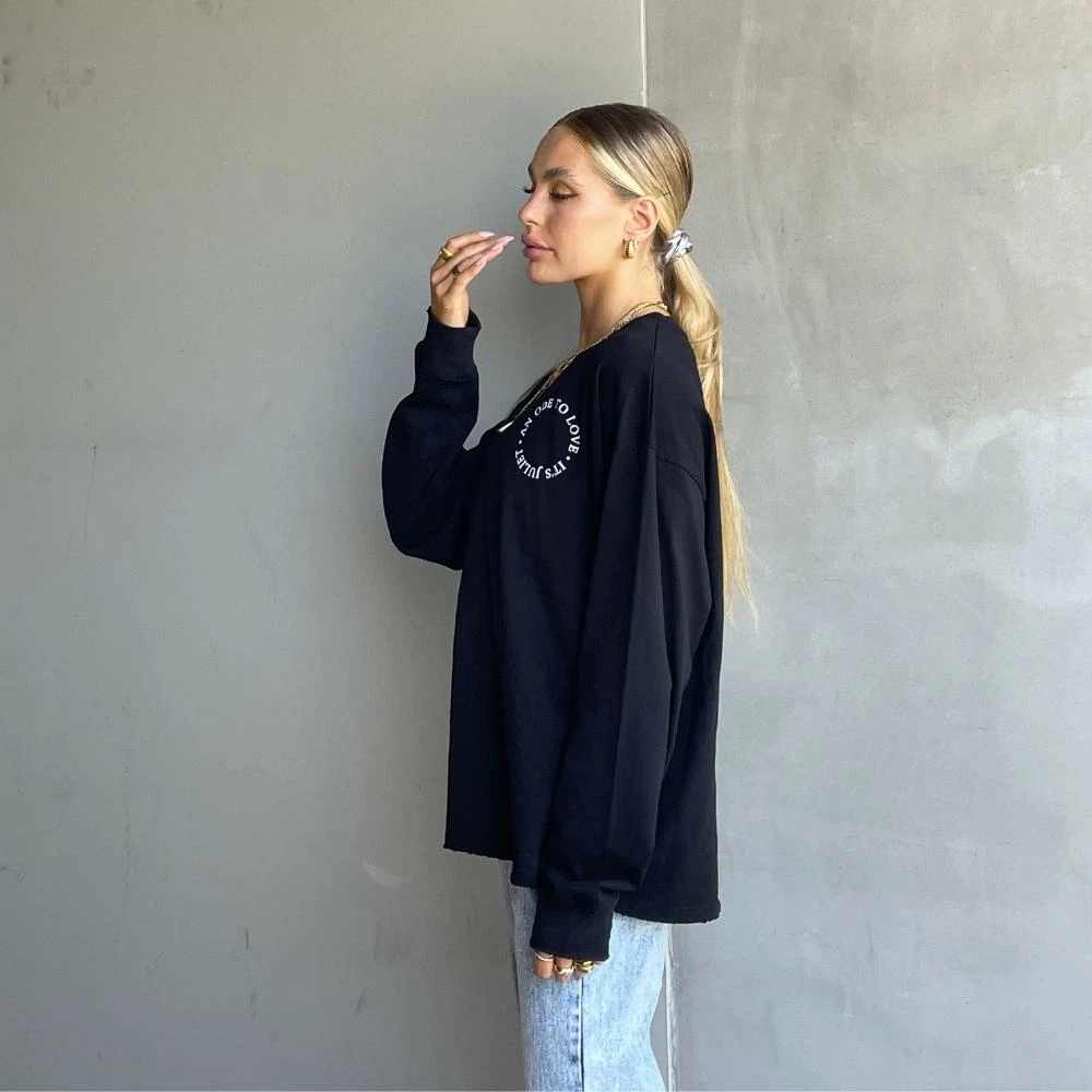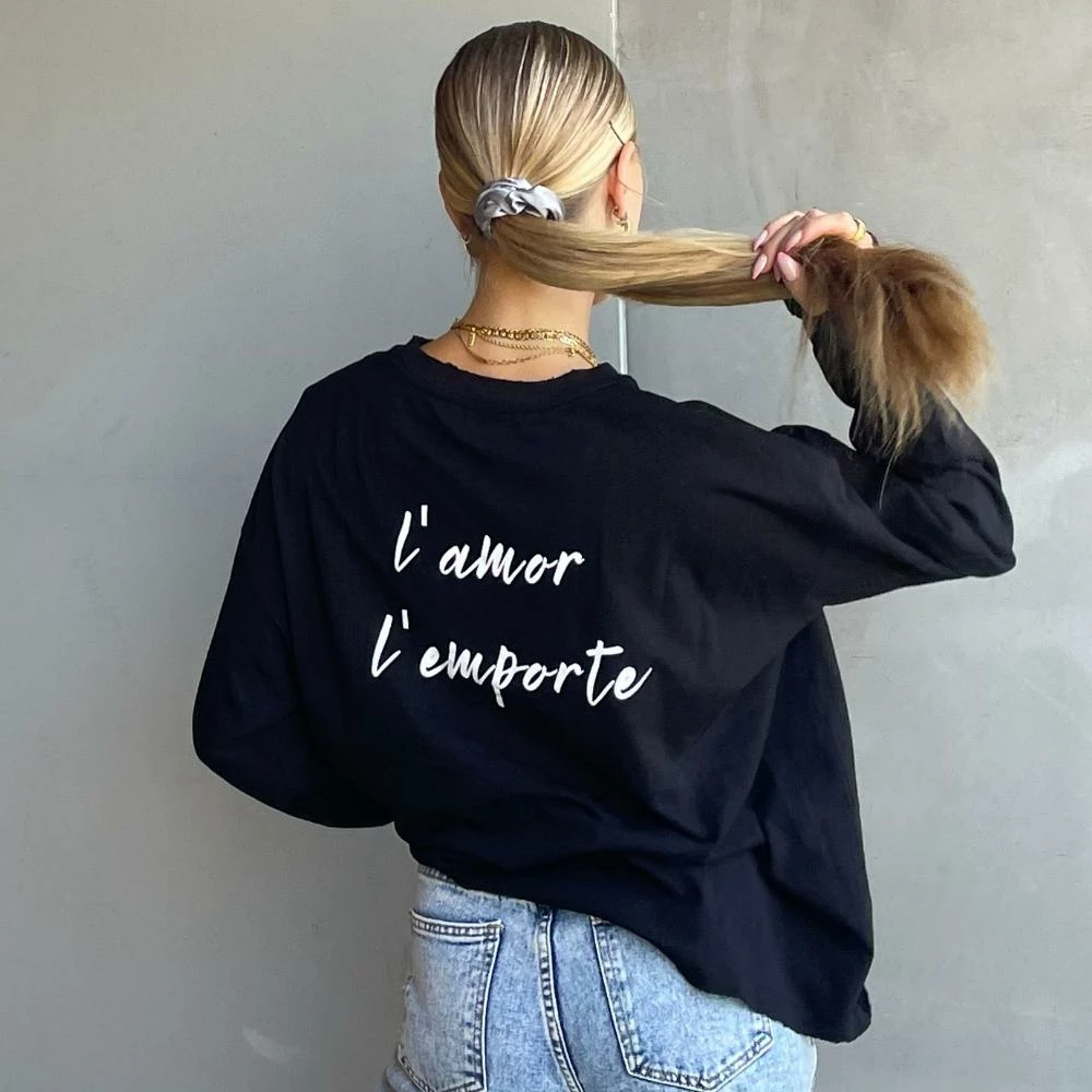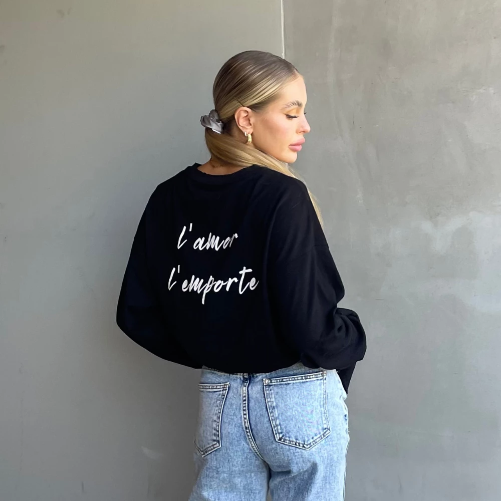 L’amour l’emporte. Translation: Love wins. Translation: Your closet needs this. Our Love Wins Oversized Sweatshirt is a black oversized long sleeve sweatshirt with cuffed sleeves, semi-destroyed edges, white graphic text on the back, and a crew neckline. Casual and comfortable for that effortless worn-in look. Pair yours with your favorite sweatpants, leggings, or denim. Cozy and positive.