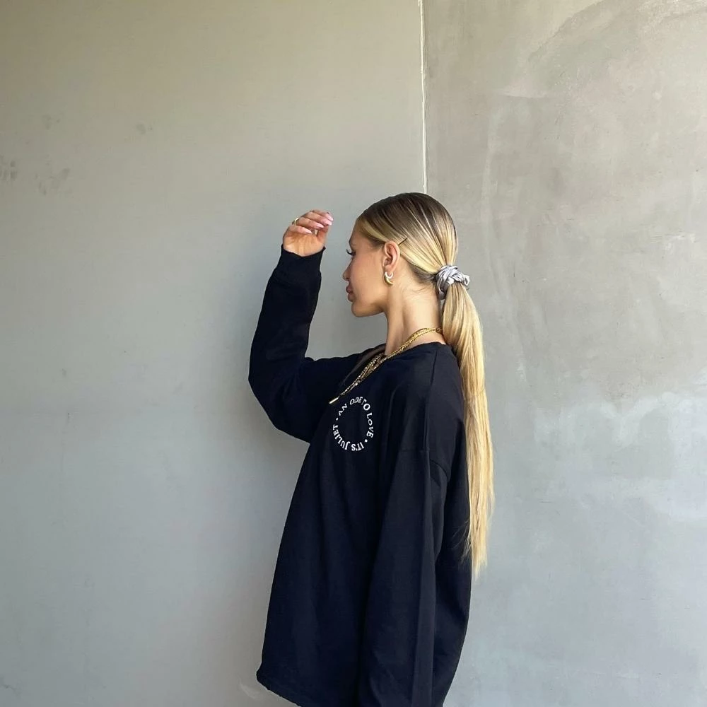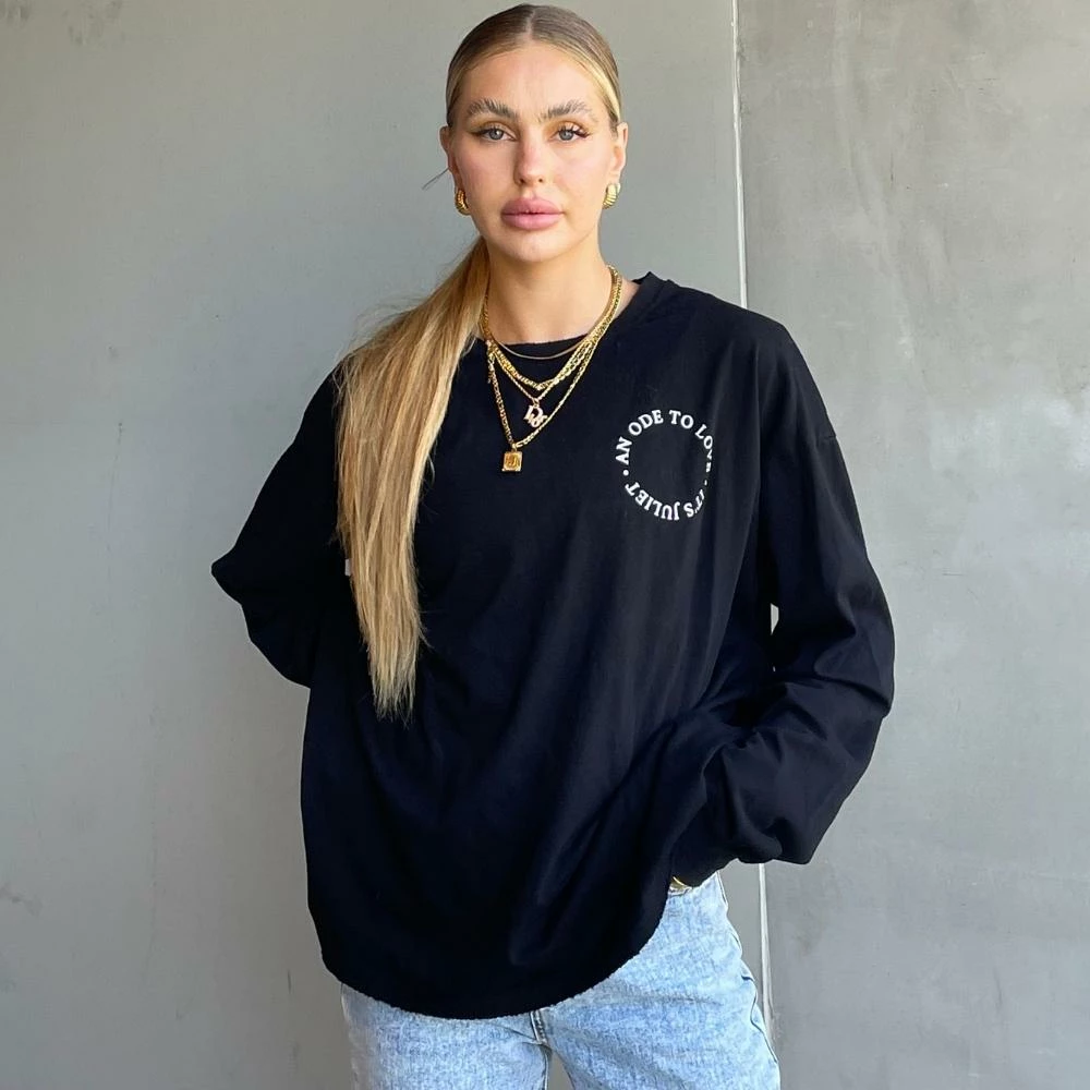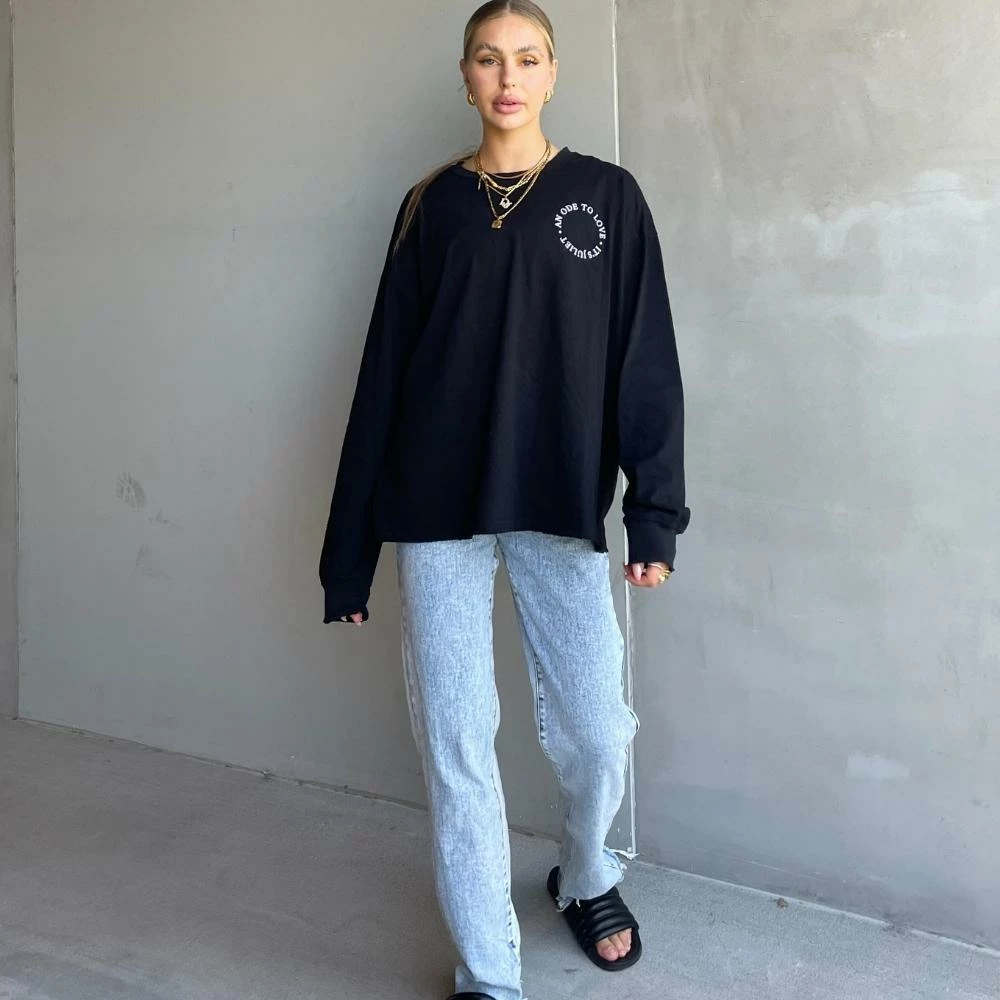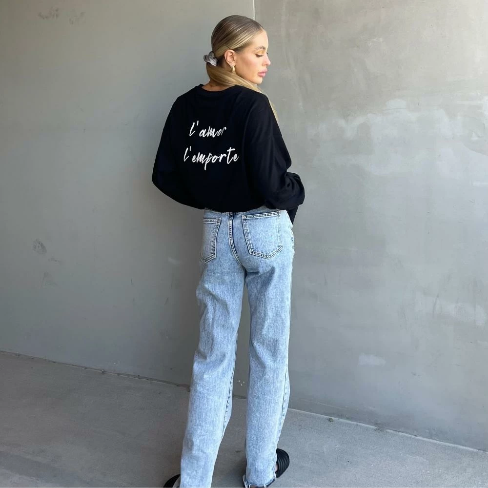 L’amour l’emporte. Translation: Love wins. Translation: Your closet needs this. Our Love Wins Oversized Sweatshirt is a black oversized long sleeve sweatshirt with cuffed sleeves, semi-destroyed edges, white graphic text on the back, and a crew neckline. Casual and comfortable for that effortless worn-in look. Pair yours with your favorite sweatpants, leggings, or denim. Cozy and positive.