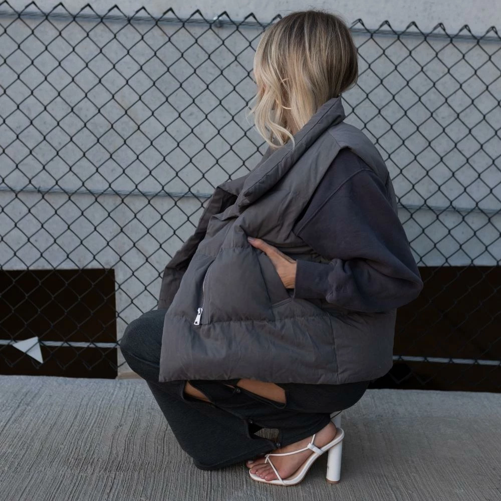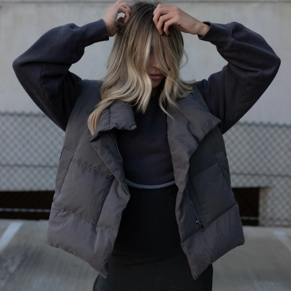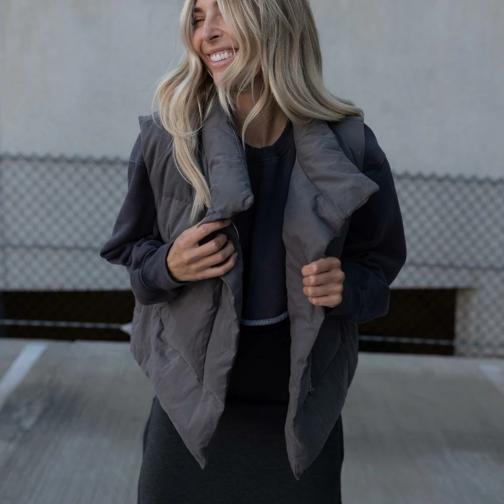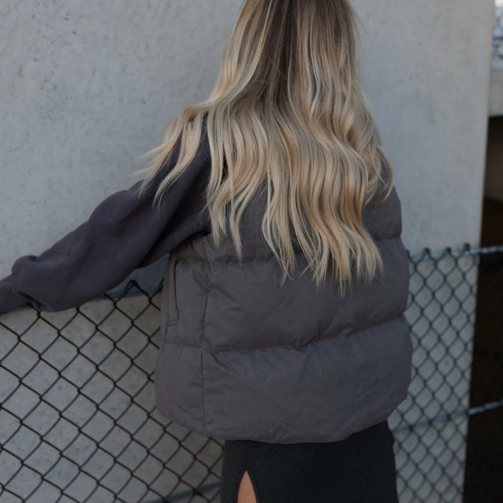 We’ve been waiting for this one. The Mason Oversized Puffer Vest features a stand collar, top magnetic button and a hidden front zipper closure, two side pockets, a super soft feel, and a loose fit. She’s made of sustainable down, is wind-proof and double lined. Pair yours with a solid long sleeve underneath, sweats, cargo pants, leggings, or denim. Has a relaxed-loose fit.