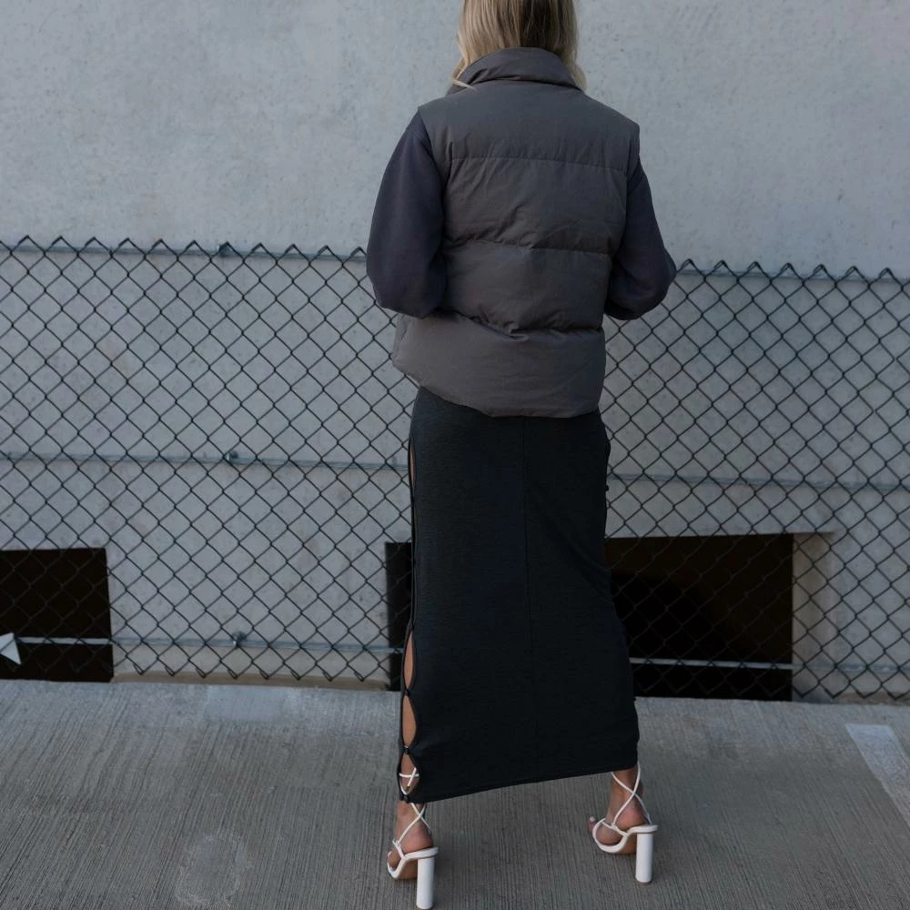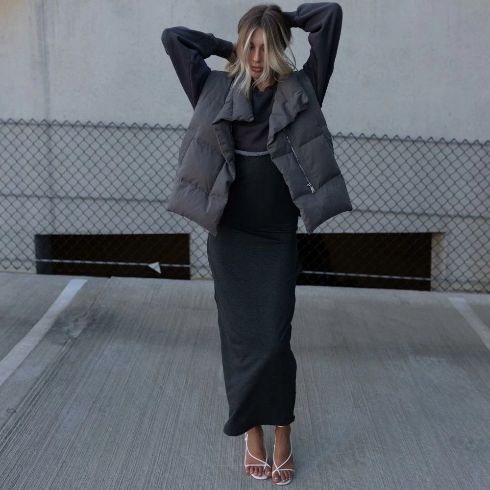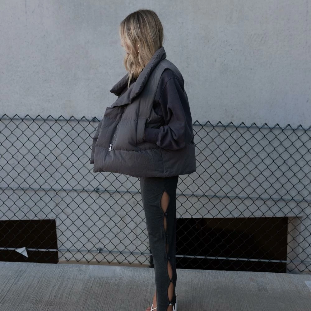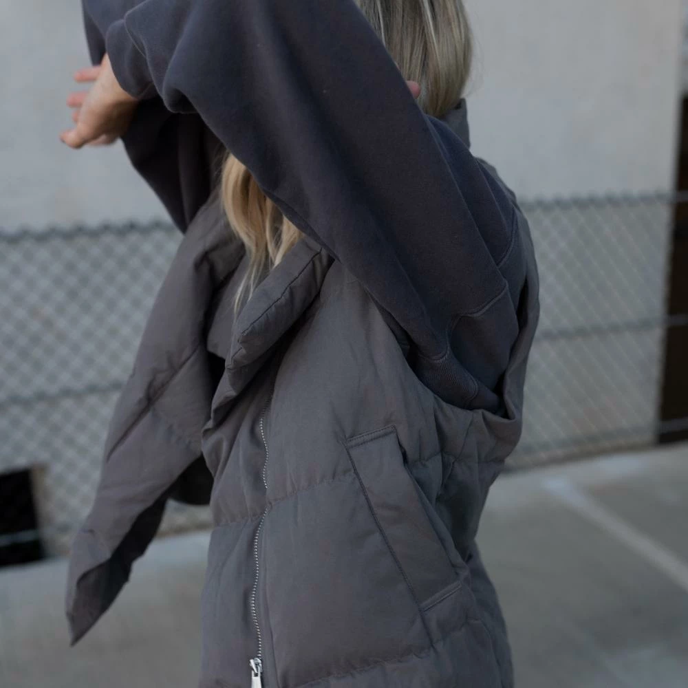 We’ve been waiting for this one. The Mason Oversized Puffer Vest features a stand collar, top magnetic button and a hidden front zipper closure, two side pockets, a super soft feel, and a loose fit. She’s made of sustainable down, is wind-proof and double lined. Pair yours with a solid long sleeve underneath, sweats, cargo pants, leggings, or denim. Has a relaxed-loose fit.