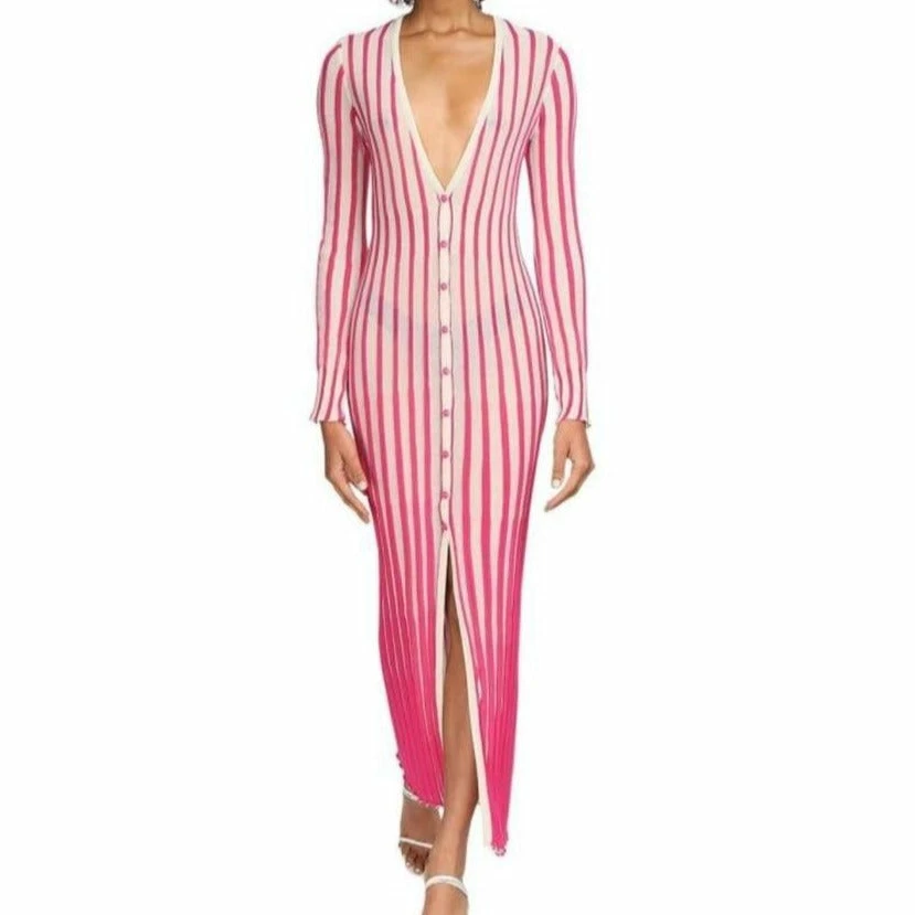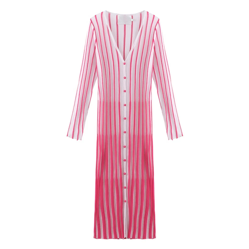Our casual and chic Maxi Cover Up is a covetable piece for the beach or a pool party. Features a sheath silhouette, V-neckline, full sleeves, button decorations, striped pattern, mid-calf length, and knit fabric. Throw it on over a white dress and it becomes a long cardigan! Can even be styled as a maxi dress with strappy sandals and a sling bag and you’re good to go!