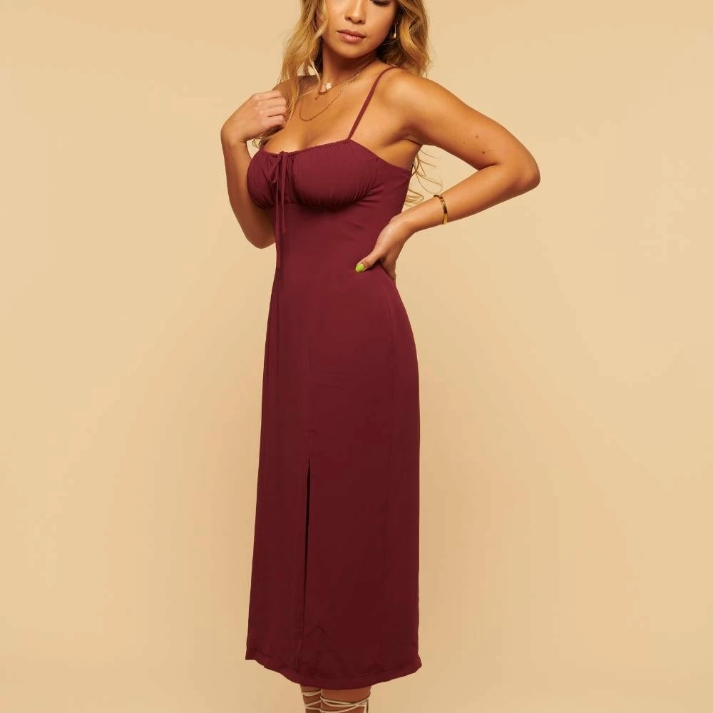 As seen on Tiktok. One of those dresses that can be worn anywhere *cue* the Hinge dates and holiday parties. This Gianna Maroon Midi Dress also has a high slit, an easy gliding invisible zip, and adjustable straps via the neckline. The neckline is our favorite part and shows just enough. Throw it on with your favorite heel or flats, and a coat or denim jacket in the colder months.