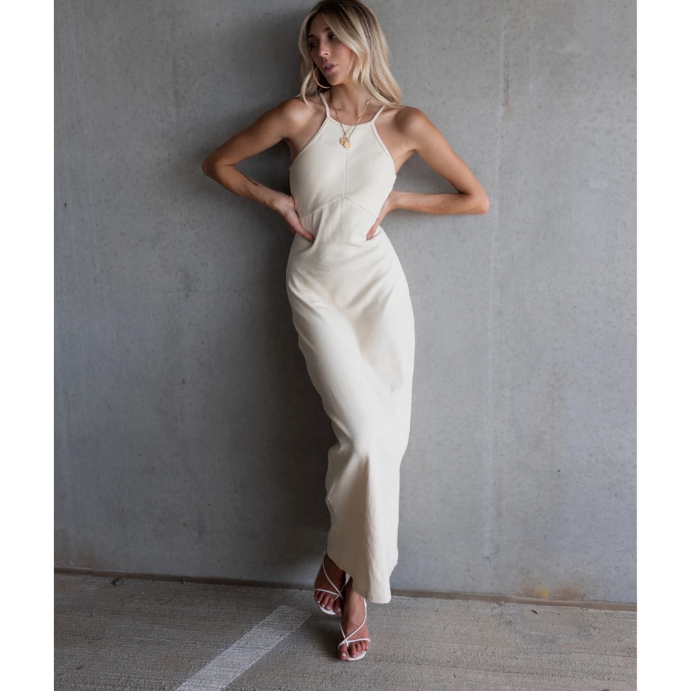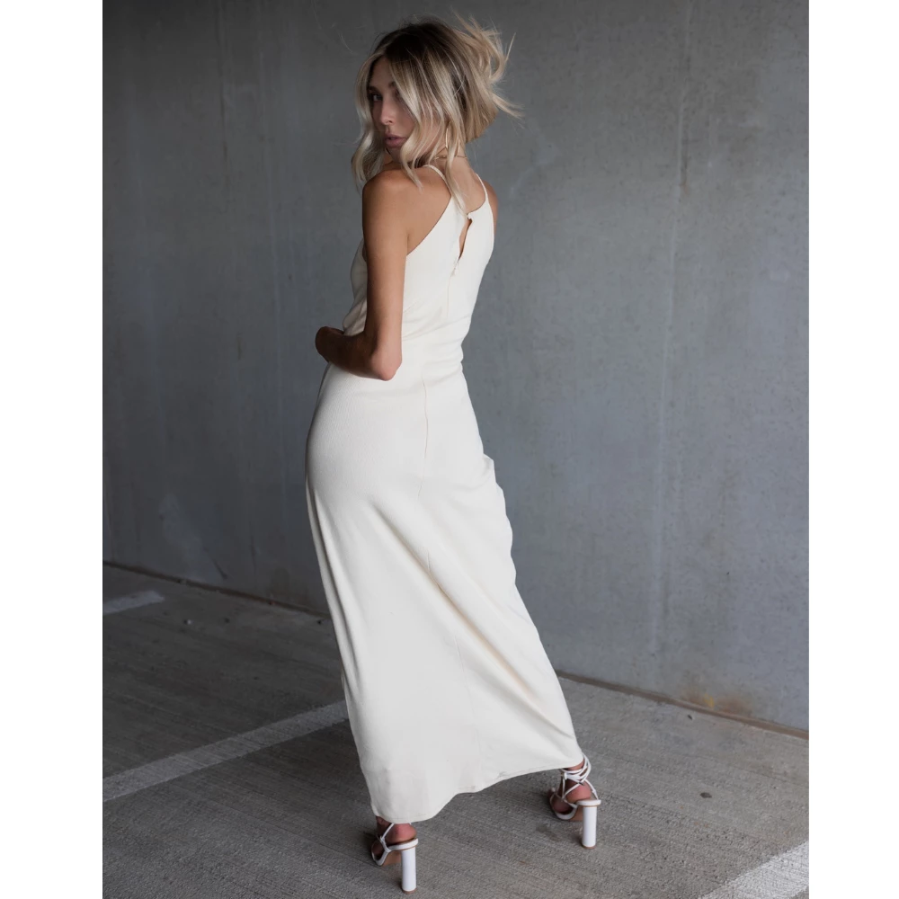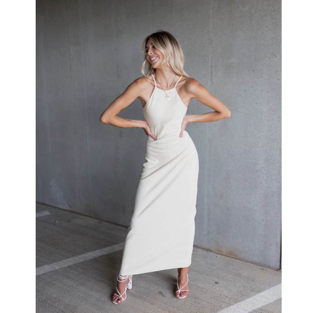 The scroll is over if you’re looking for *that* staple maxi dress to wear under your blazer or to that spring and summer event coming up. This maxi dress is a panelled and soft ribbed knit with a halter neckline, a diagonal chest design, a small loop button closure in the back, and a small invisible back zip that glides. Team her up with stacked hold necklaces and your favorite heels or kicks.