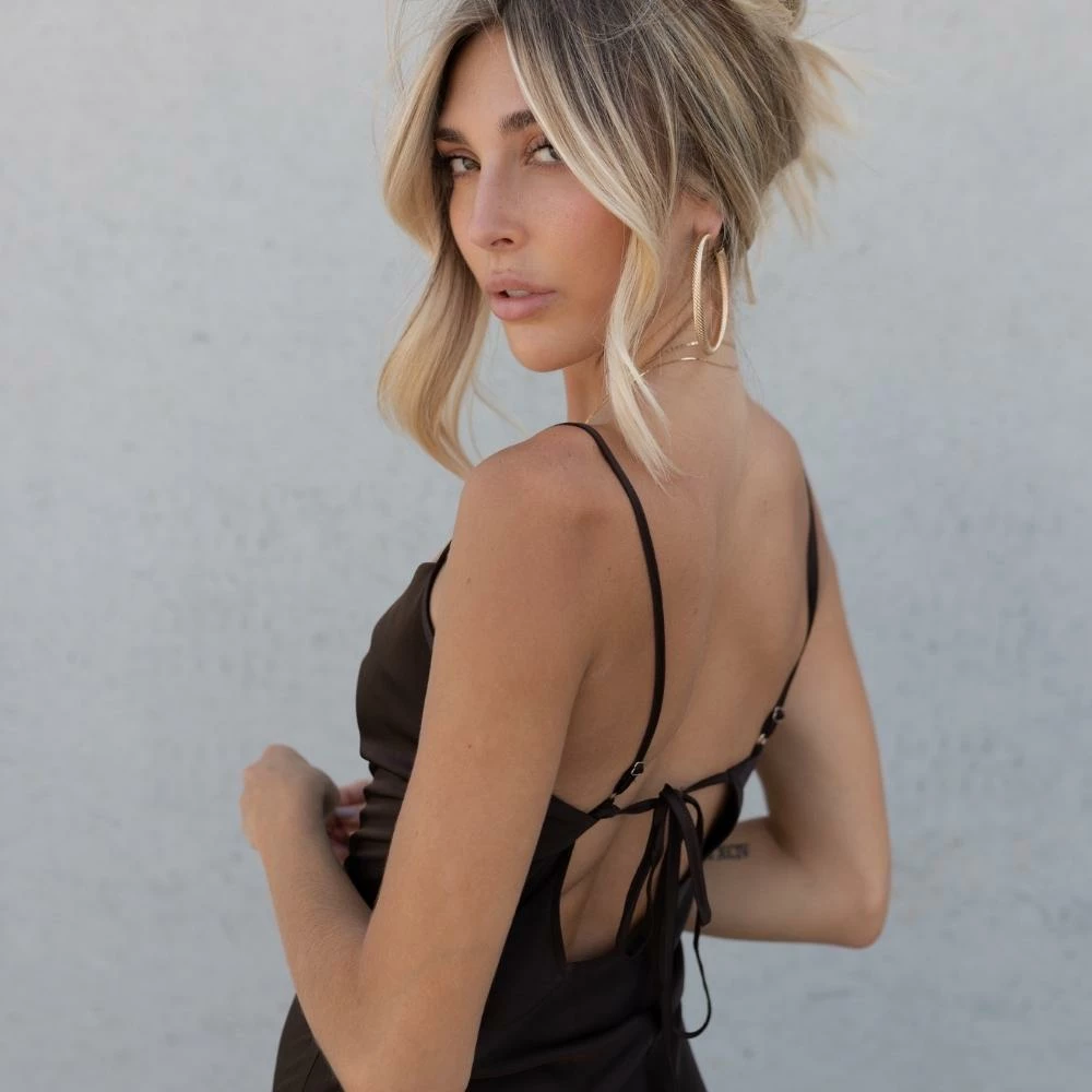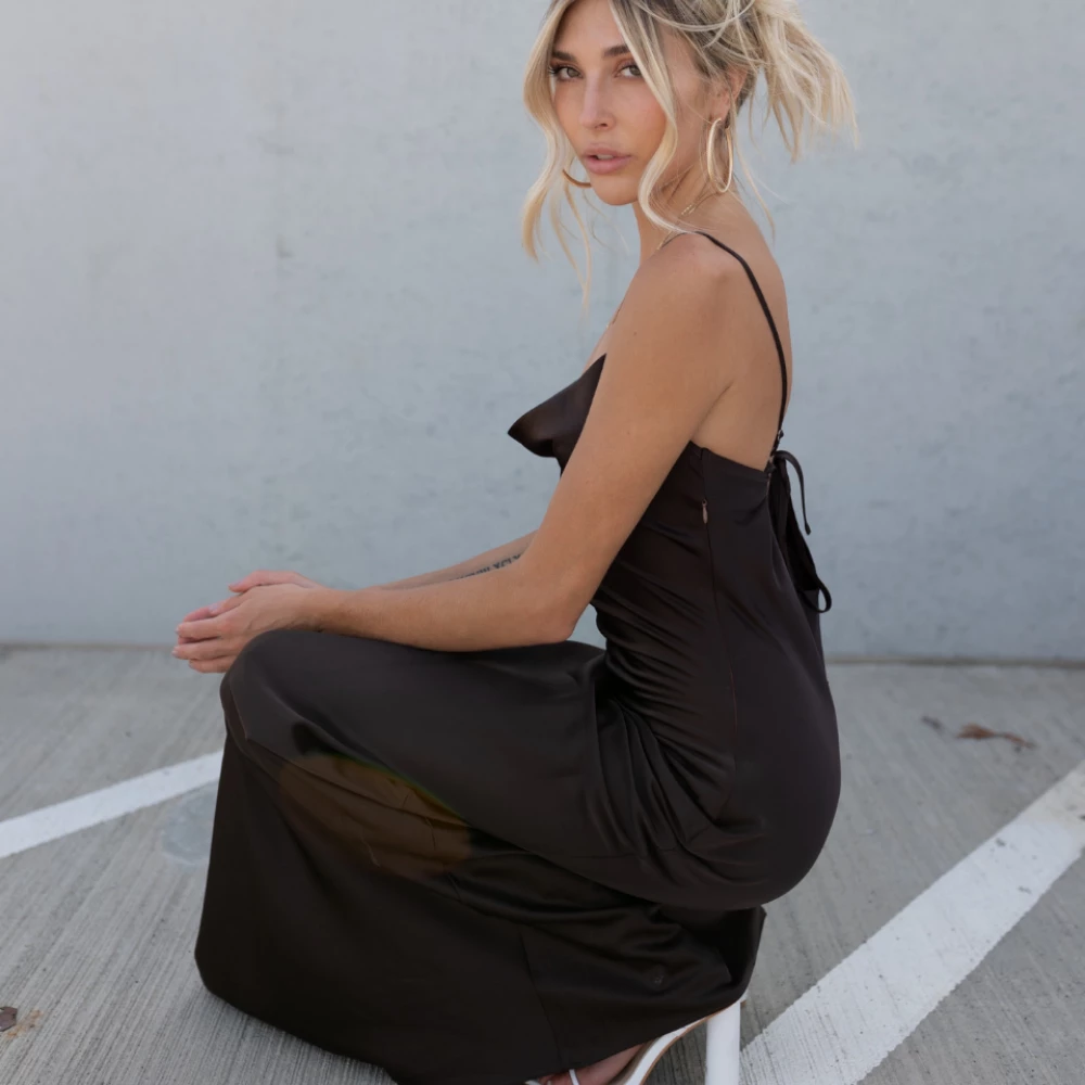 We’re ready for wedding season, or any event really. We love the thin and silky feel of this brown maxi dress. The Monroe Maxi Dress features an open back with a tie, adjustable straps, a flattering cowl neckline, a bias cut, maxi length, and a hidden side zip. Pair with your favorite pair of strappy heels and take her out. We’re obsessed with the beautiful satin tailored for a perfect flow and fit.