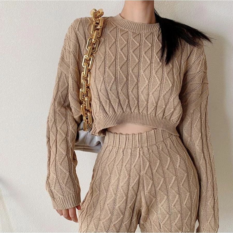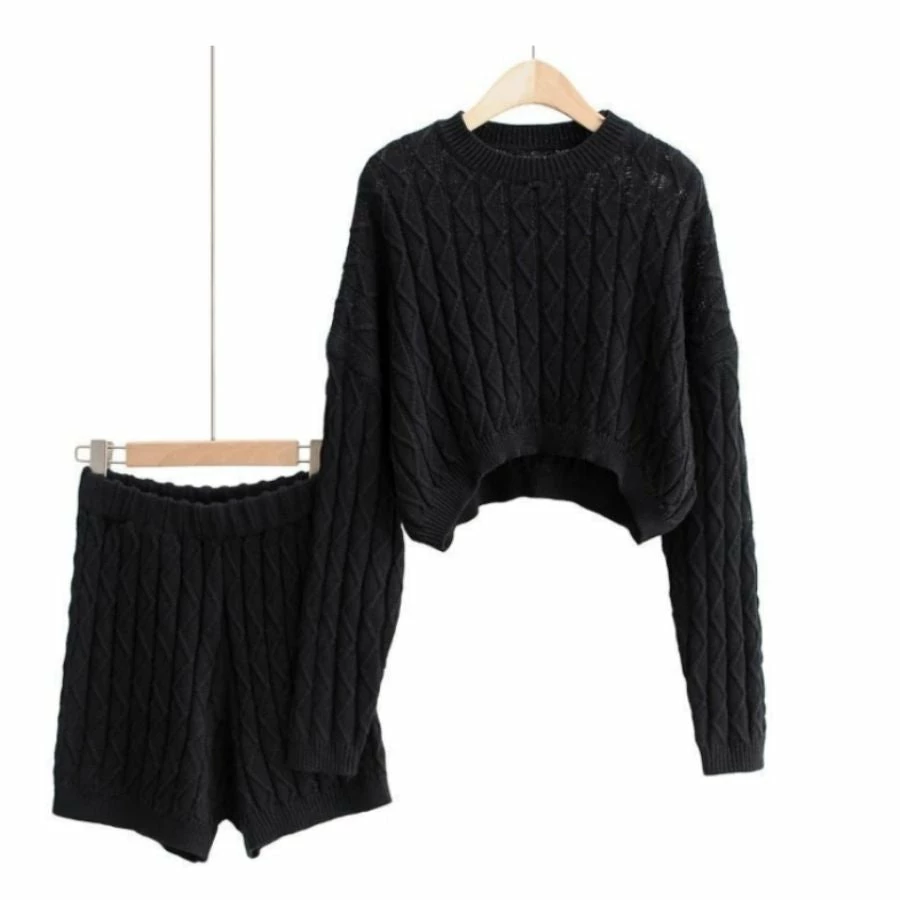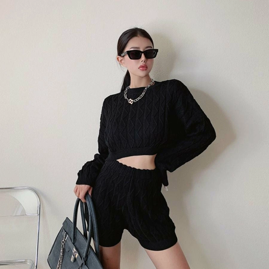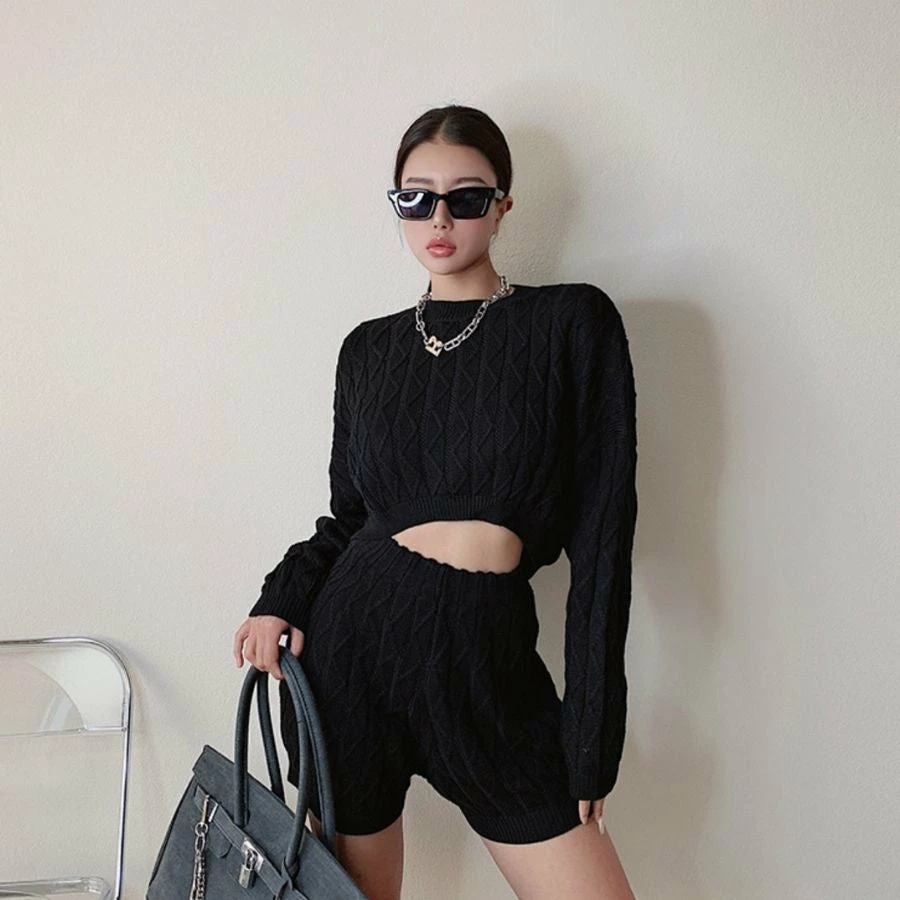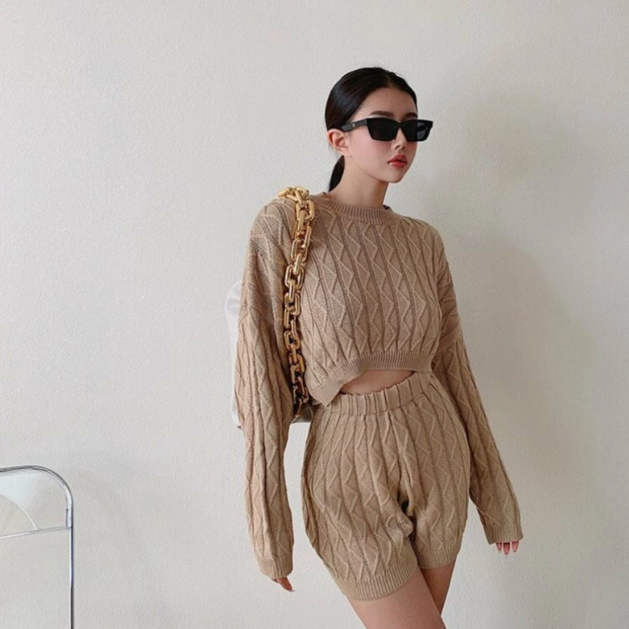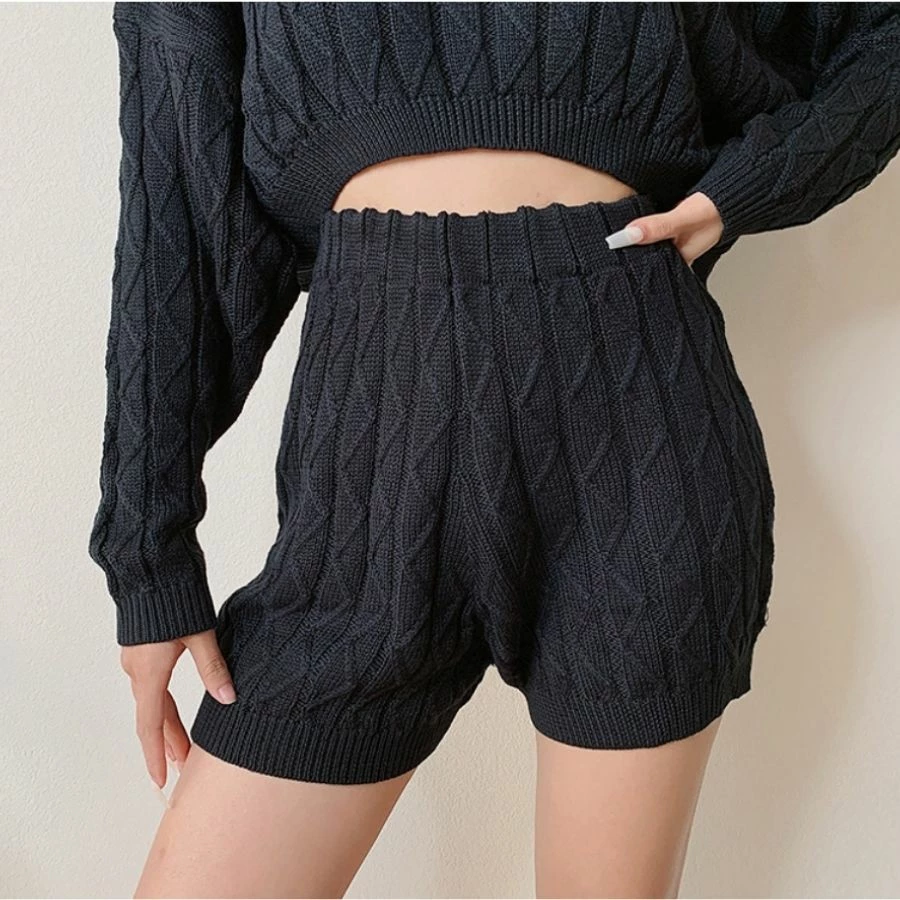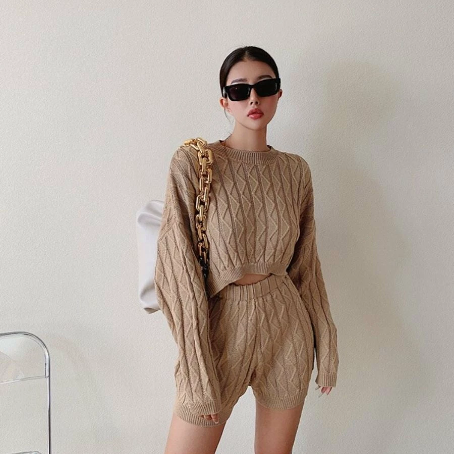 Comfy clothes only club. Our Natalie Two Piece Shorts Set features a ribbed knitted long sleeve sweater with a curved edge, and matching high rise shorts with an elasticated waist. We love the loose fitting sweater and fitted shorts set for a casual lounging around the house day, or an errands day (aka target). Pair yours with slip on sandals and look put together without sacrificing comfort.