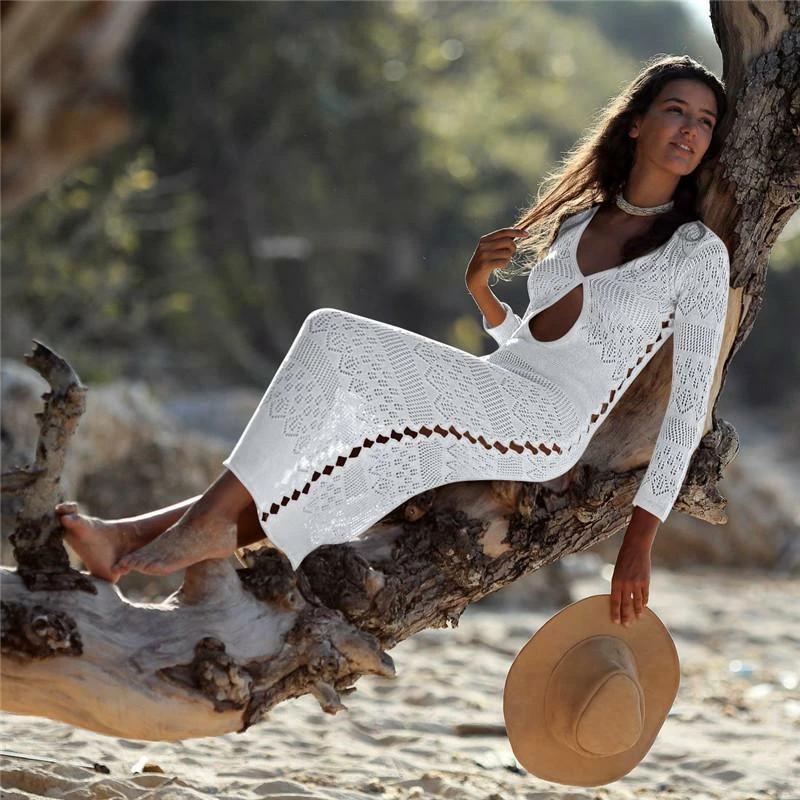 You’ll be wearing the Priscilla Knit Midi Dress year after year. Features a beautiful crochet knitted design throughout, semi-quarter long sleeves, a deep scoop neckline, side and upper midriff cutouts. An essential knitted cut out midi-maxi dress for that vacation getaway, beach or pool day cover up, or for a casual outing. Style as a dress or over your favorite swimsuit as a cover up. Pair with strappy sandals or flats. Hits at mid-calf.