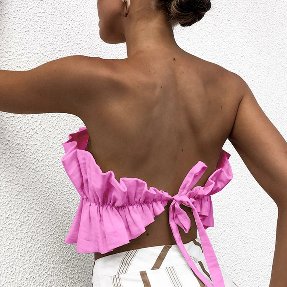 The Ruffle Strapless Tie Top. She’s back in limited quantities. This cropped top features a cropped cut, a split-ruffled design, and a tie-up closure in the back. We love how we can wear her with many fits – and she’s definitely coming with us on any vacay. Style with high rise shorts, denim, skirts, or your favorite bottoms.