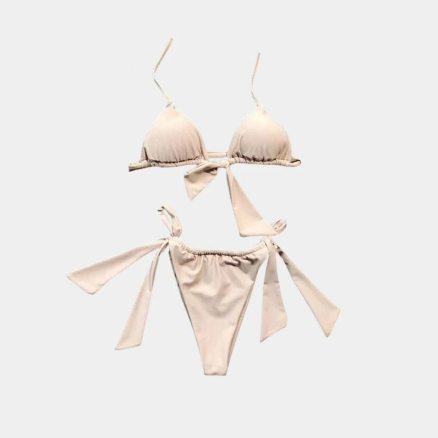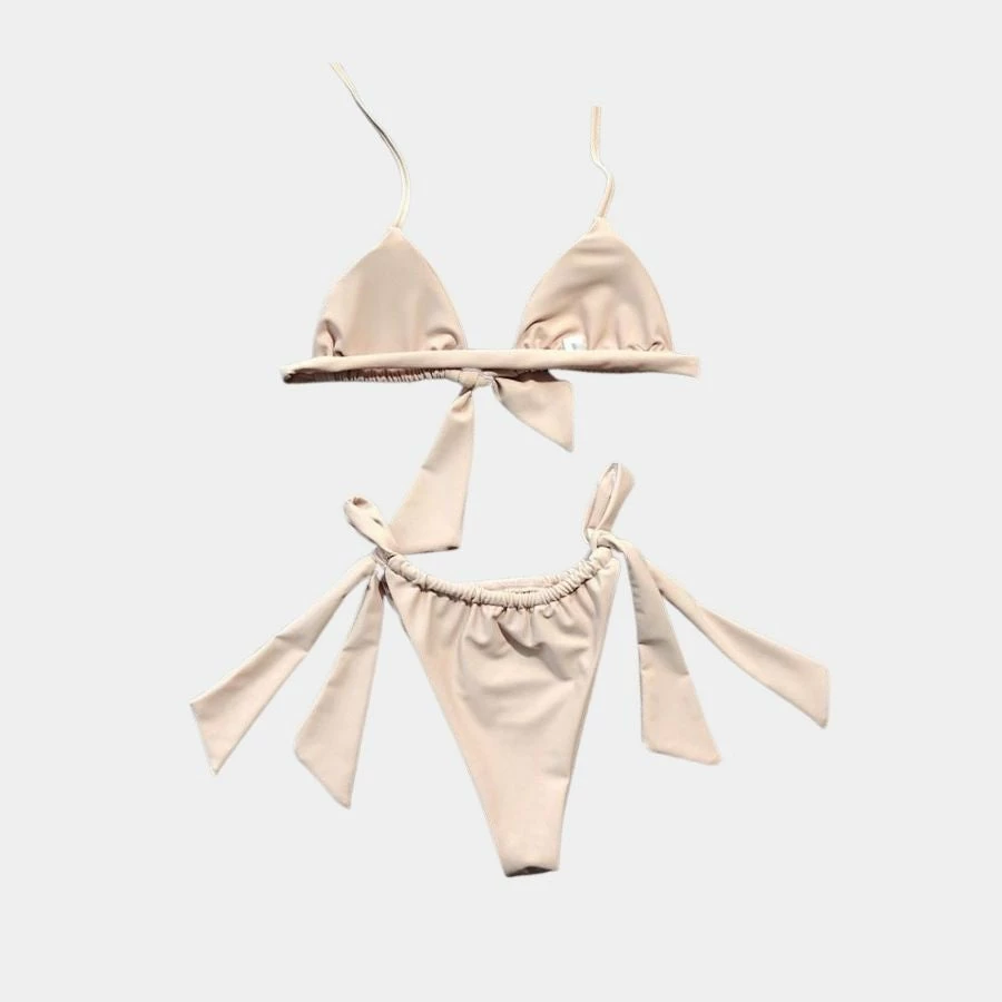 Our Sand High Leg Bikini Set is the two piece you need when headed to the beach, or posing for your IG. This bikini features everyone’s favorite high cut, side tie, low waist bottoms, wire-free support and padding on the top, along with halter top straps, and some bow detailing. This cute, but sexy bikini paired with your favorite linen or denim shorts, sunnies, and SPF are the move. Get set for the beach vibes in this tan suit.