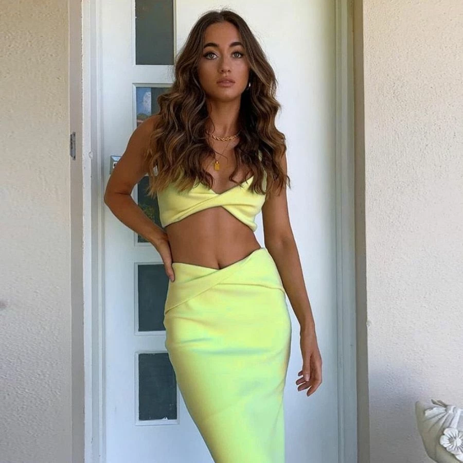 One of our favorites, and we guess yours too! The Avalon Crop Top and Skirt Set features a crop top and a matching ankle-length skirt with a slit. The skirt has a straight silhouette, an elasticated waist, and a thigh slit. The crossover crop top has a v-neckline, thicker straps, and a pullover style – no zippers. Pair yours with heeled sandals, a mini bag, and make your entrance into a Spring a statement.