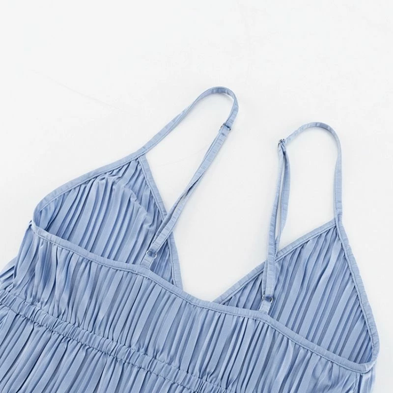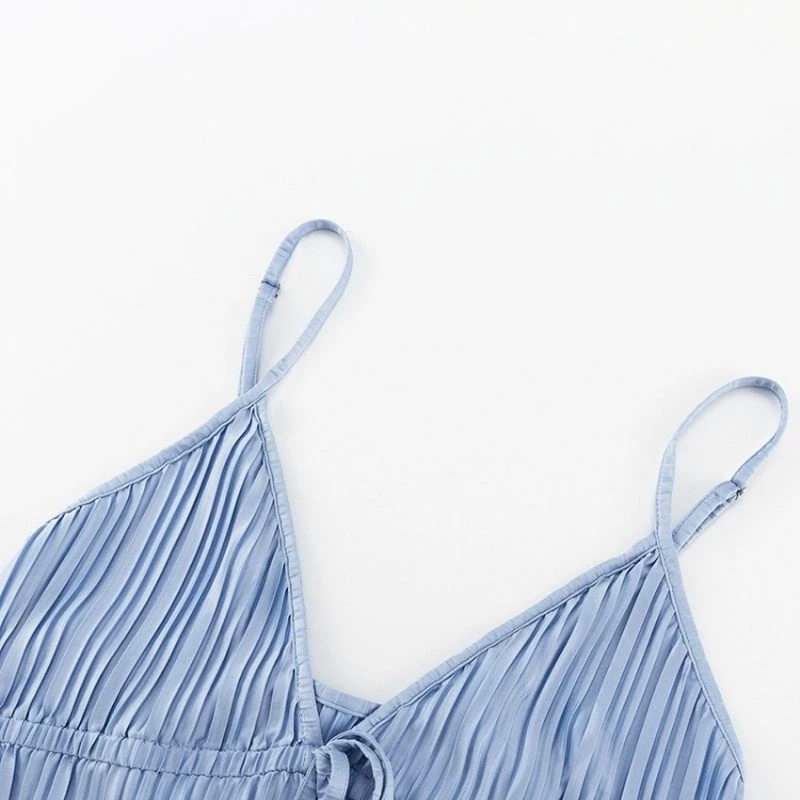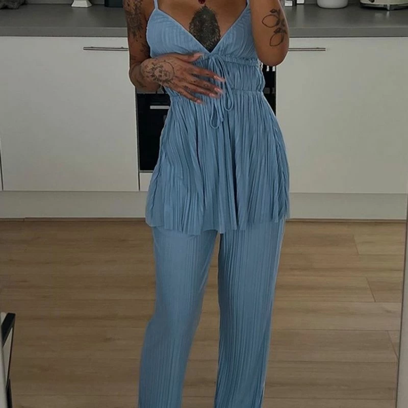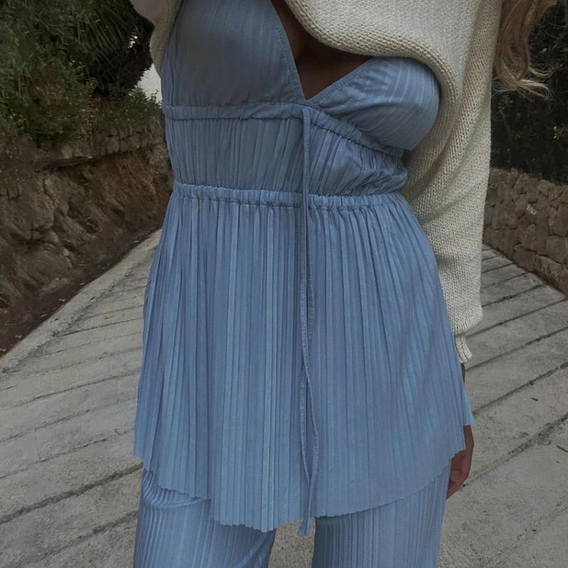 This Blue Skies Two Piece Set is a pleated set featuring a plunge v-neckline, long style top, adjustable straps, and matching high-waisted pleated pants with an elasticated waist. Pair with your favorite small purse or clutch, nude sandals, an a natural tan.