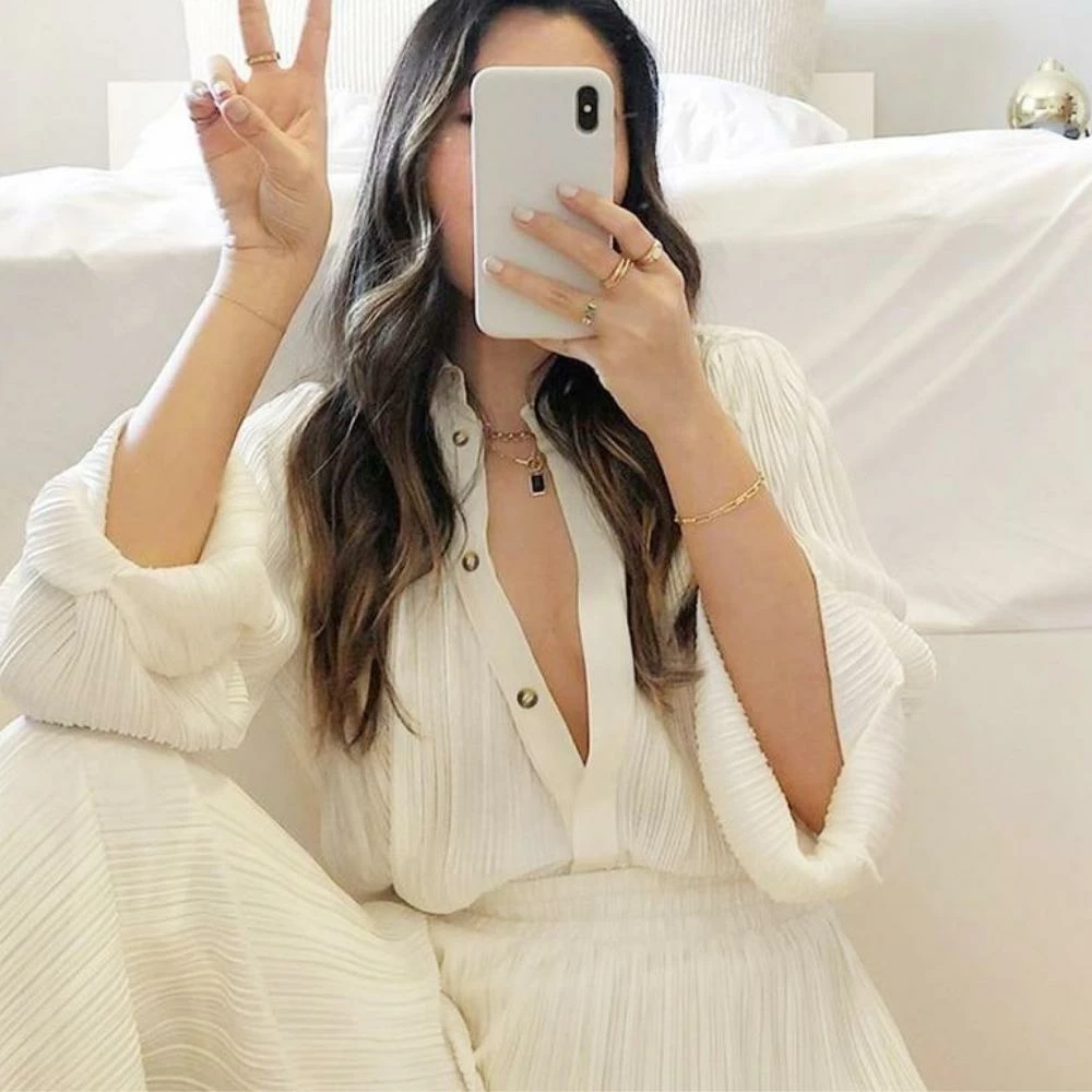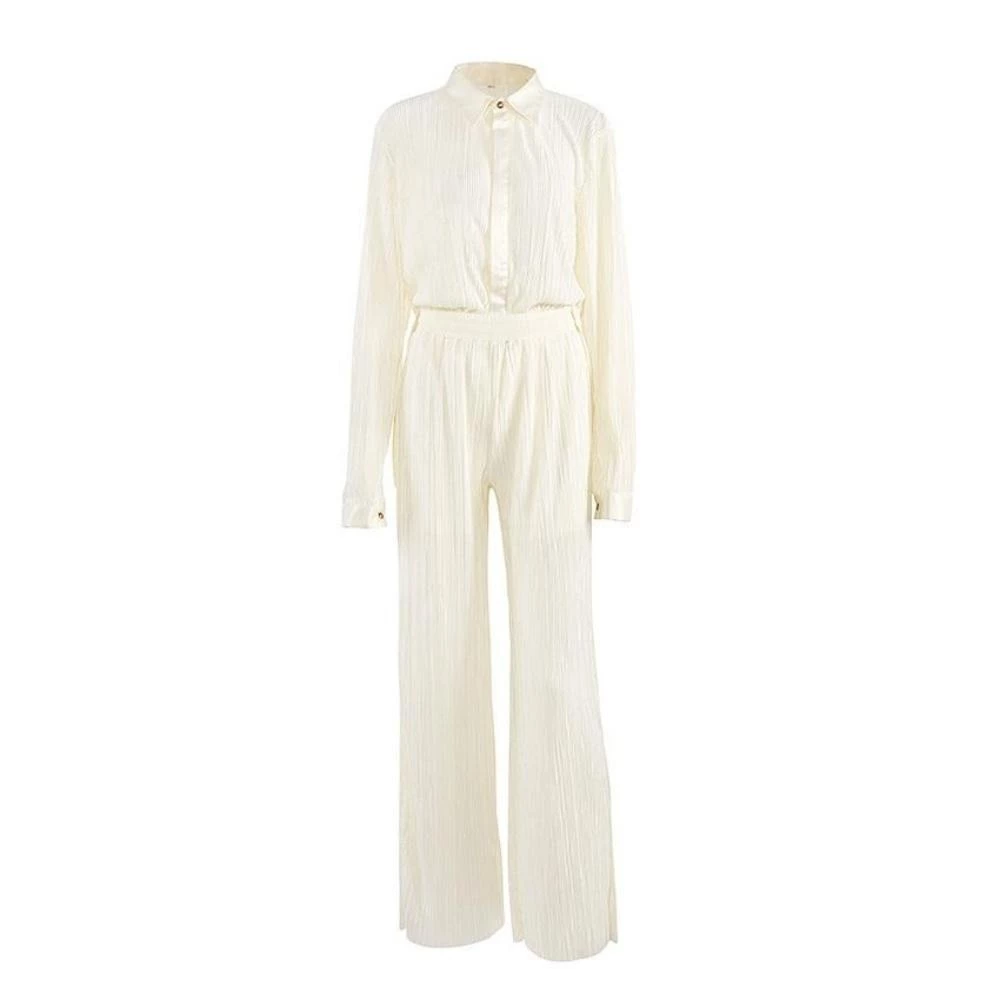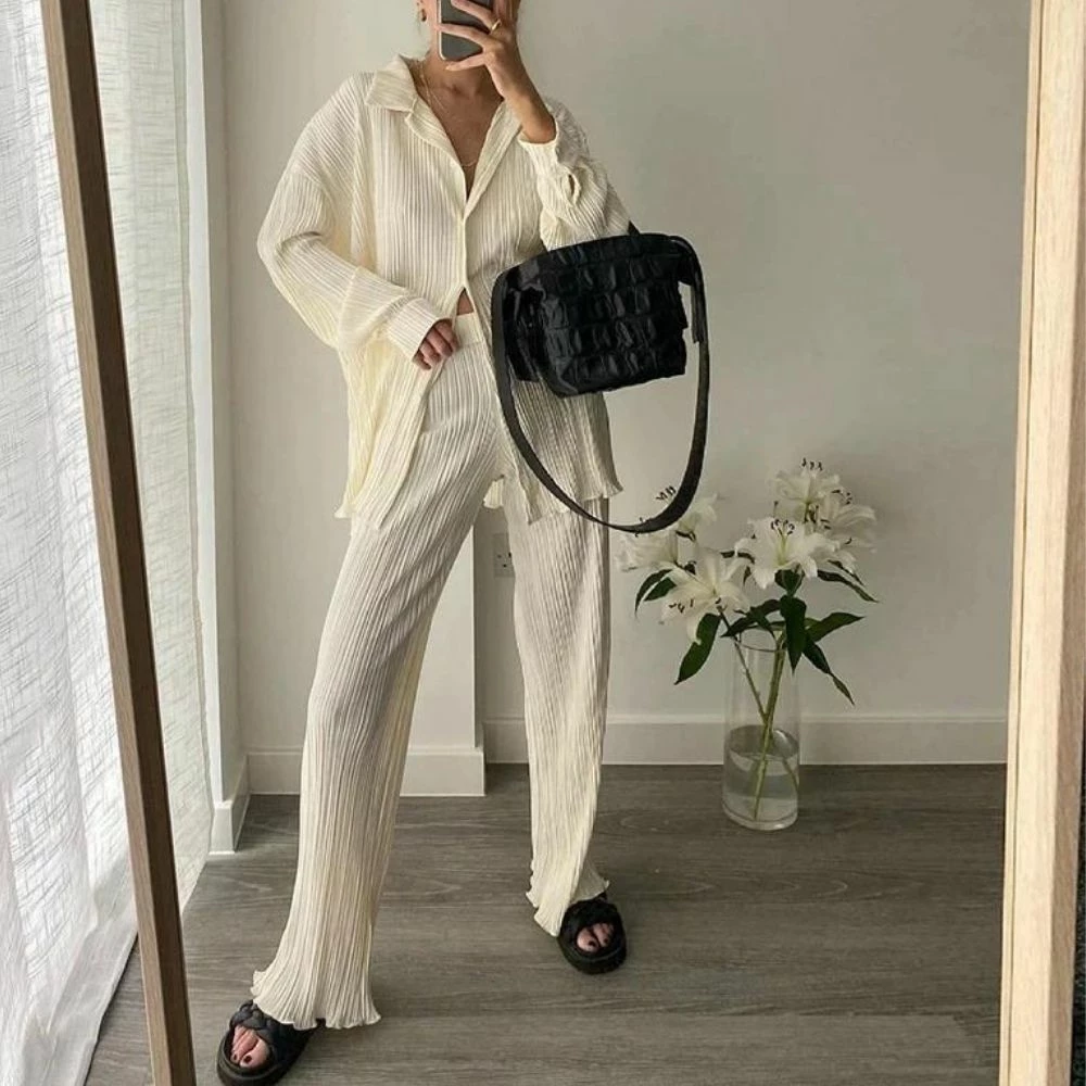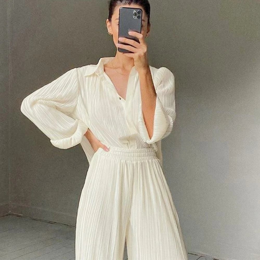Comfort comes first with our Flynn Lounge Set. This set, sold together, comes with full length pleated wide leg pants with an elastic waist and a sophisticated loose collared top with tortoise flat buttons. Perfect for everyday wear, Sunday brunch, and countless events. Pair this set together for a matching set outfit, or style each piece separately. Top fits loose. Bottoms true to size.