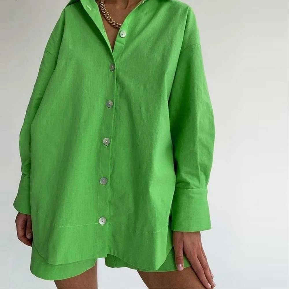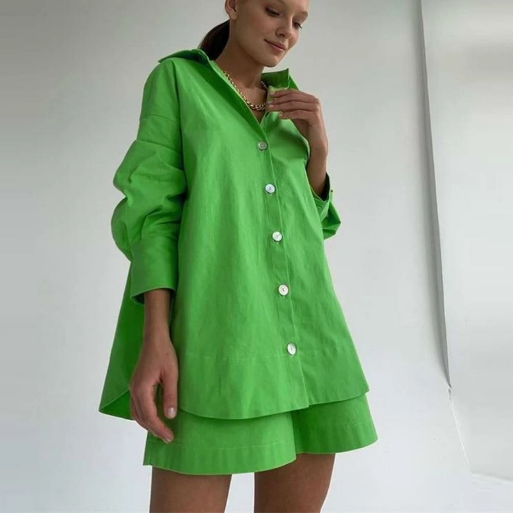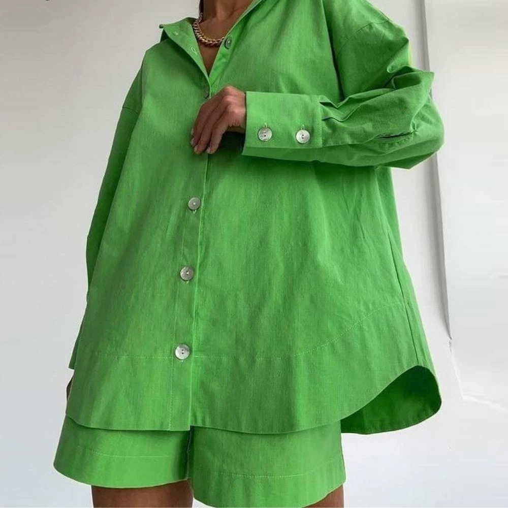 There’s nothing cooler or more comfortable. The Lexi Two Piece Lounge Set features an oversized solid poplin long sleeve shirt with a turn-down collar, single button closure, and matching short bottoms with an elasticated waist. Leave the shirt semi-unbuttoned, or style the poplin shirt with your favorite pair of denim or leggings. Either way, you’re in for a relaxed fitting, flattering, and comfortable fit.