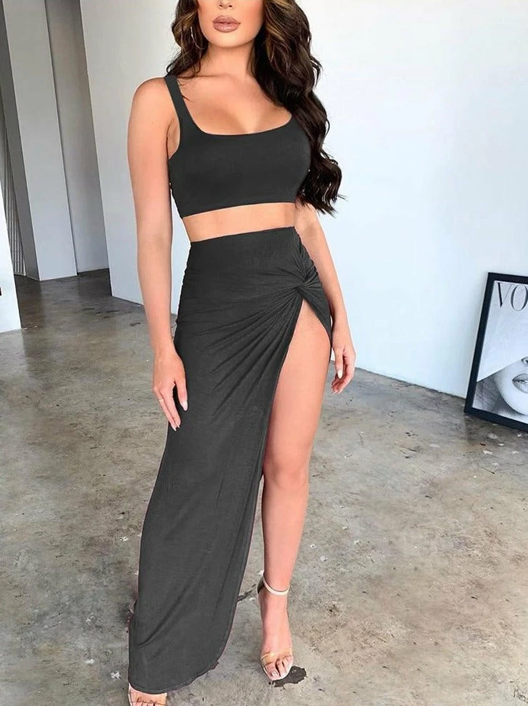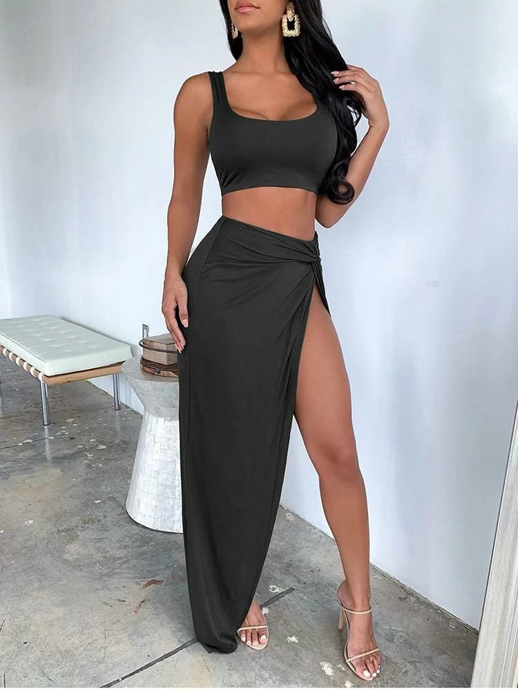 A maxi two piece skirt set is all you need. Our Mika Two Piece Maxi Skirt Set includes a square crop tank and a maxi skirt with a thigh-high slit and knotted waist that’ll make your instagram *pop* and have your S.O. drooling. This matching set is perfect for that lounge-style vacation or your night out with the girls. Can be styled with heels, strappy sandals, and an over the shoulder messenger bag.