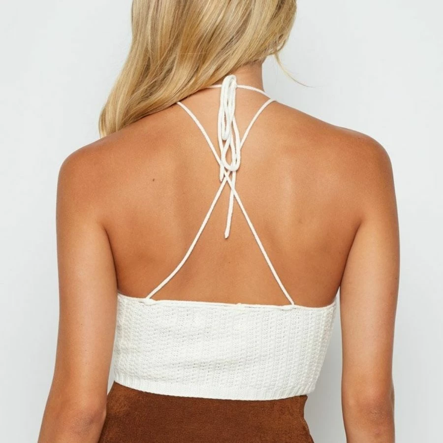 Get evening or festival ready with the Violetta Knitted Halter Top. This 70’s inspired knit crop top features a tie halter neck, front criss cross detailing, a cropped length, and a curved front edge. Made with a knitted material with stretch, this top pairs well with matching trousers, or flare leg denim.