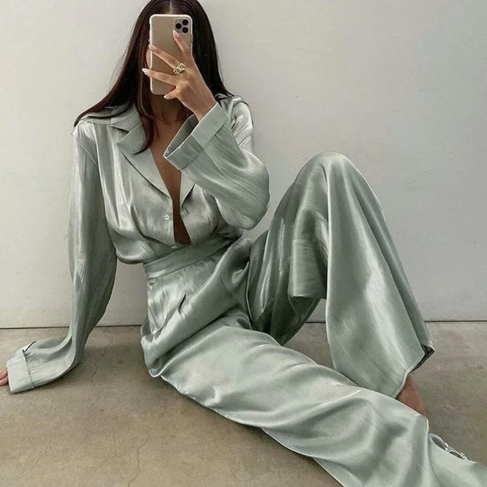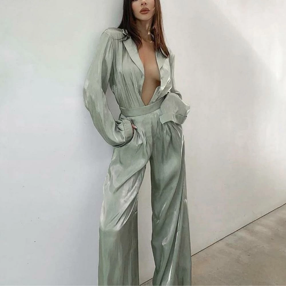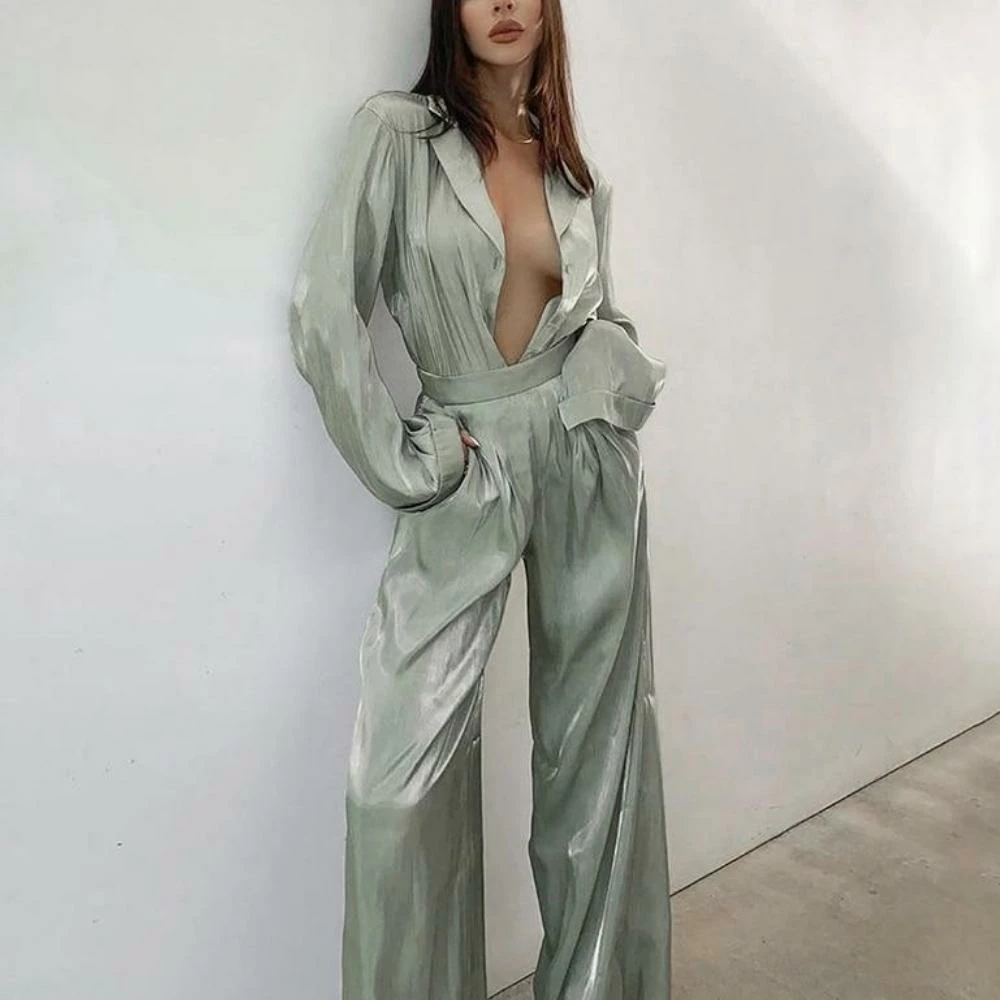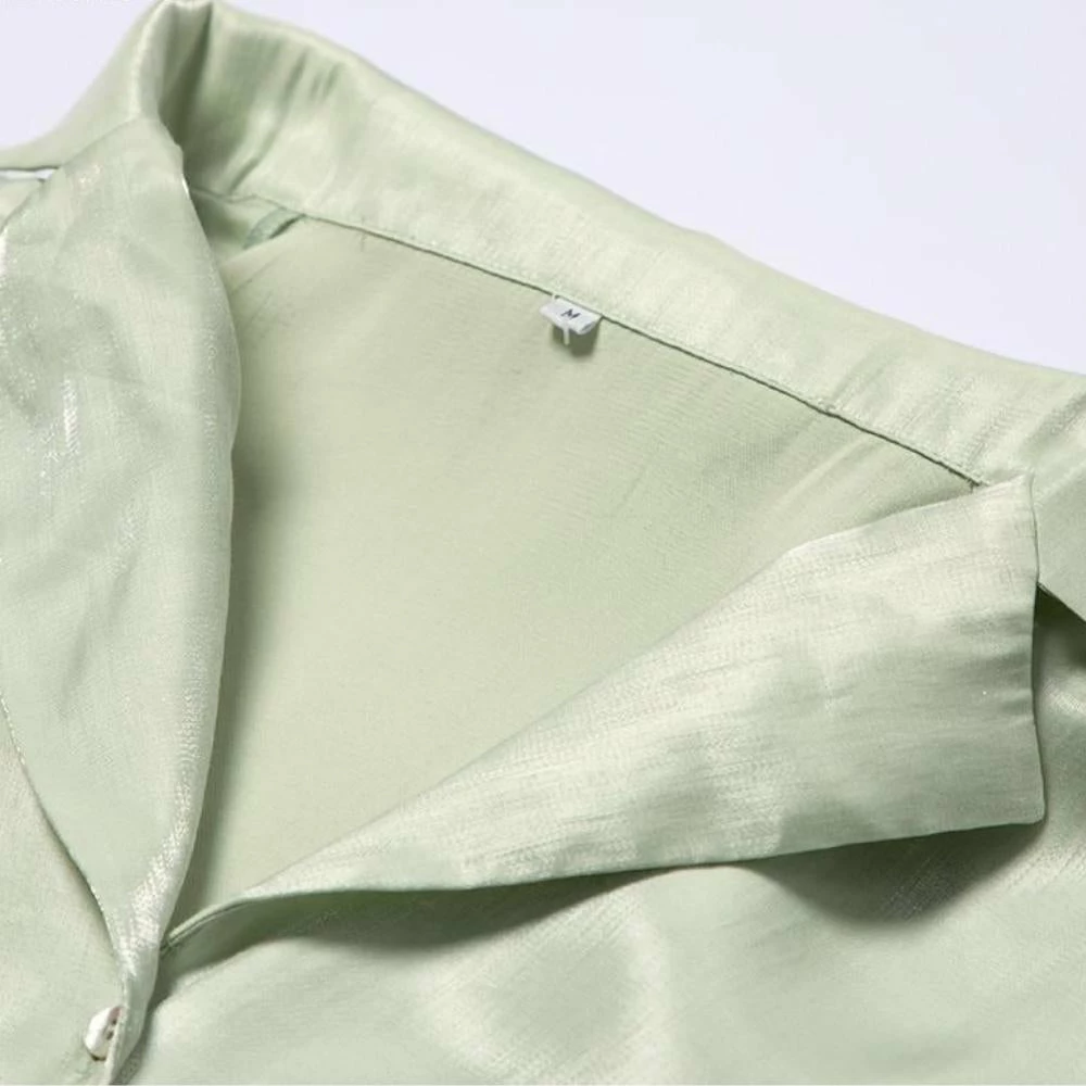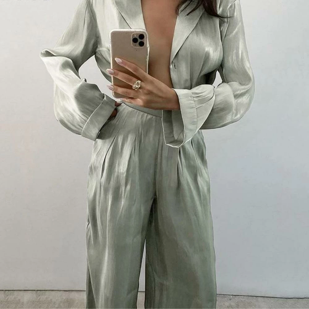 Our Cameron Two Piece Set is a fan favorite. Features a green loose-fitting blouse with a turn-down collar and a single-breasted button closure, with matching high waisted elastic waistband trousers. Pants are wide-leg with a stretchy band in the back, front side slit pockets, and a small side zipper. Wear each piece on its own, or tuck in the top and wear as a matching set.